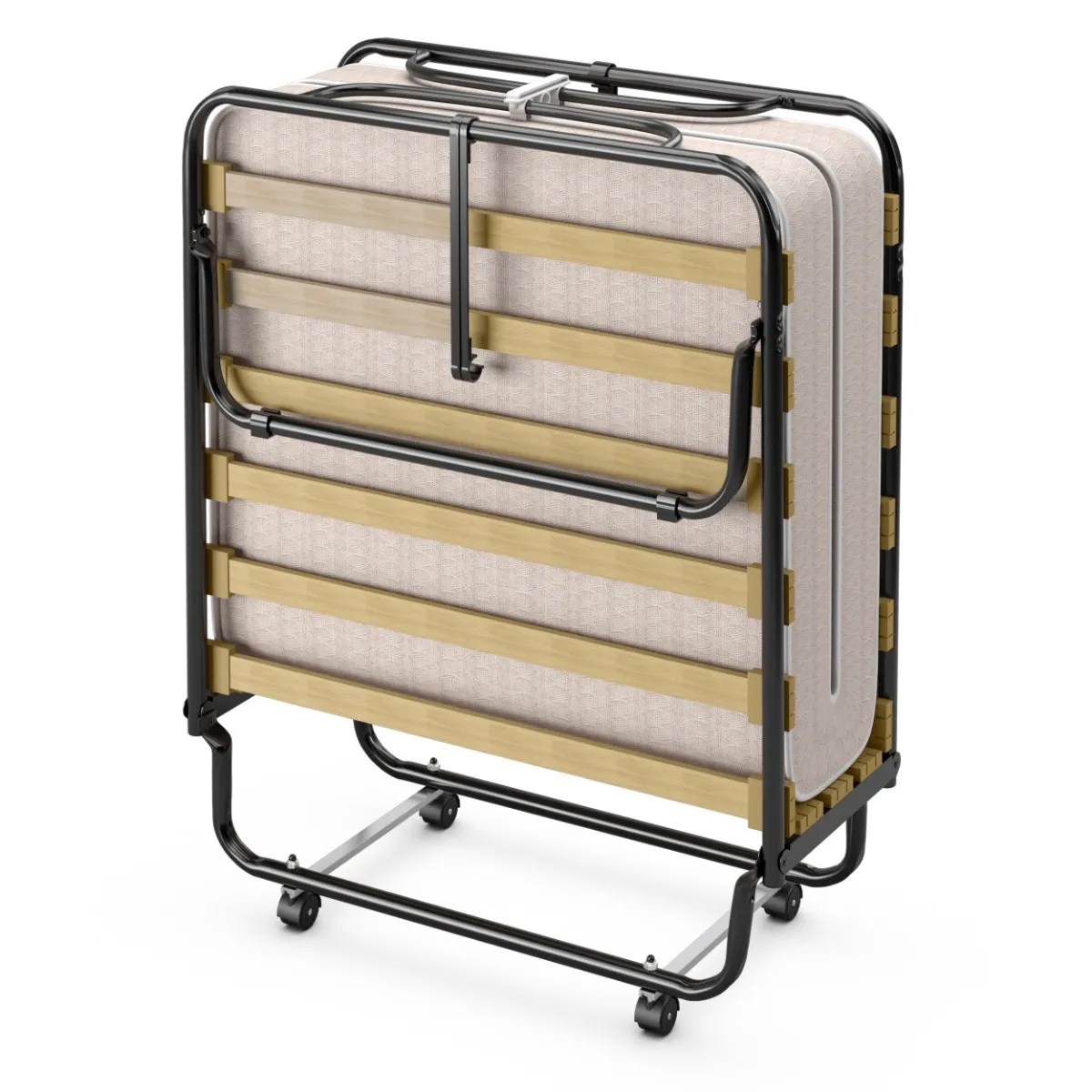 Dan mag u dit opklapbed met traagschuim matras niet missen. Dit matras is voorzien van traagschuim met hoge dichtheid en ondersteunend basischuim, een zachte en ademende hoes voor een optimale en comfortabele slaap voor u of uw vrienden/gasten. Gebouwd uit een zwaar stalen frame met roestwerende coating en antislipmatten, garandeert het bedframe grote stabiliteit en langdurig nut. De lattenbodem, bestaande uit 15 houten planken, biedt over het algemeen goede ondersteuning voor het hele bed. Het kan een gewicht tot 130 kg dragen, wat betekent dat zowel volwassenen als kinderen het kunnen gebruiken. Het opvouwbare ontwerp bespaart veel ruimte en met de 4 wielen kunt u het bed heel gemakkelijk verplaatsen. U kunt het bed overal gebruiken waar u het nodig heeft.