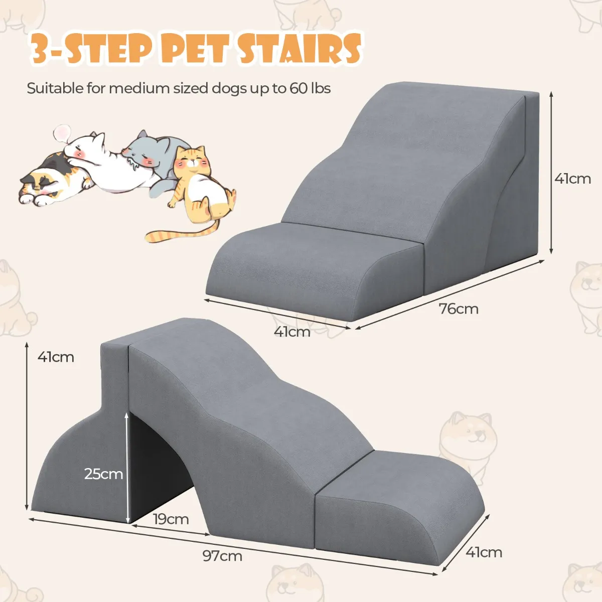 Ondersteunend schuim met hoge dichtheid: Gevuld met 30D schuim met hoge dichtheid zorgt de hondenhelling ervoor dat de treden hun vorm en structuur behouden zonder te vervormen. Tegelijkertijd vermindert het de druk op de poten van je huisdier. De opstapjes kunnen tot 30 kg dragen en zijn geschikt voor middelgrote honden.