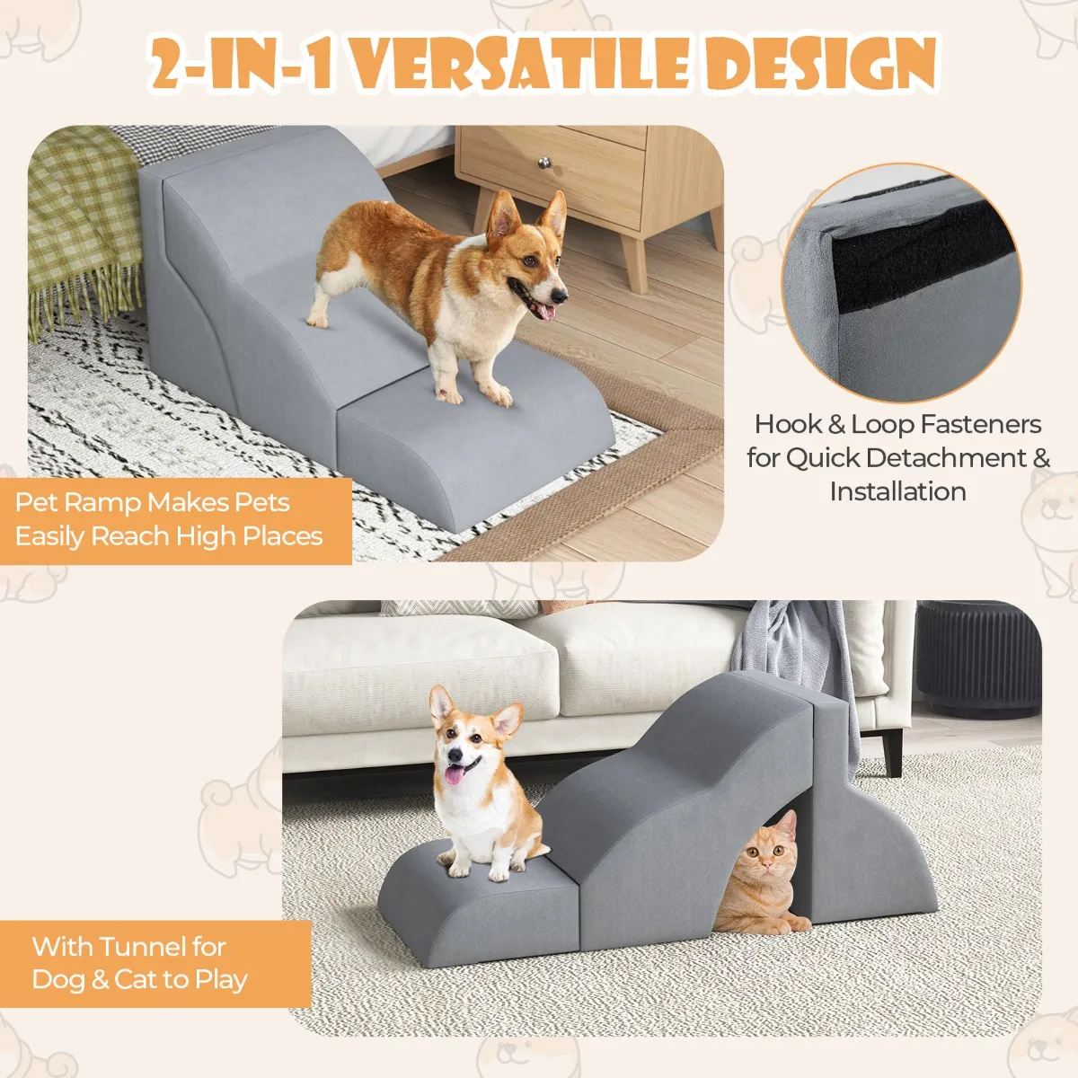 De veelzijdige hondentrap bestaat uit 2 delen, zodat je een tunnel kunt maken waar katten zich kunnen verstoppen en spelen. Of je kunt ze combineren als een 3-staps schuimrubberen hondenhelling. In tegenstelling tot plastic hellingen die oncomfortabel en onstabiel kunnen zijn, is onze helling gemaakt van schuim met een hoge dichtheid om de druk op de gewrichten van je huisdier te verlichten en een uitstekende ondersteuning te bieden. Bovendien biedt de zachte helling van 3 niveaus gemak voor oudere of gewonde honden om gemakkelijk toegang te krijgen tot verhoogde bedden en banken. Onze hondenhelling van schuimrubber met 4 niveaus is gemaakt van eersteklas materiaal, wat zowel comfort als duurzaamheid garandeert. De suède stof zorgt voor een zachte, anti-slip ervaring. De hoes kan in de wasmachine worden gewassen en is afneembaar voor eenvoudig onderhoud. Bovendien zorgt de anti-slip siliconen onderkant van onze hondenhelling ervoor dat uw huisdier veilig blijft tijdens het klimmen. We leveren een pluche dierenrol om je te helpen dierenharen gemakkelijk van de bank, stof en trap te verwijderen. Voor uw gemak zal onze vacuüm verpakte oprijplaat van schuimrubber na 24-48 uur zijn volledige grootte bereiken.