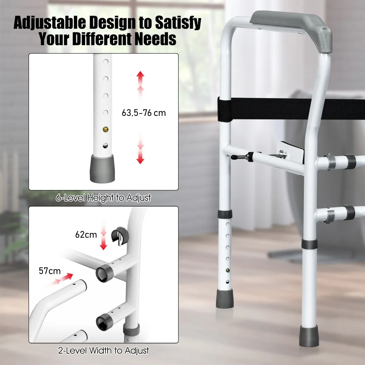 【Geschikt voor de meeste toiletten】Met een verstelbare hoogte van 63-76 cm en een verstelbare breedte (56,5 cm/62 cm) werkt deze toiletrailing niet alleen met de meeste standaard toiletten, maar stelt de gebruiker ook in staat zich aan te passen aan zijn behoeften. Lichaamsgrootte en vorm .