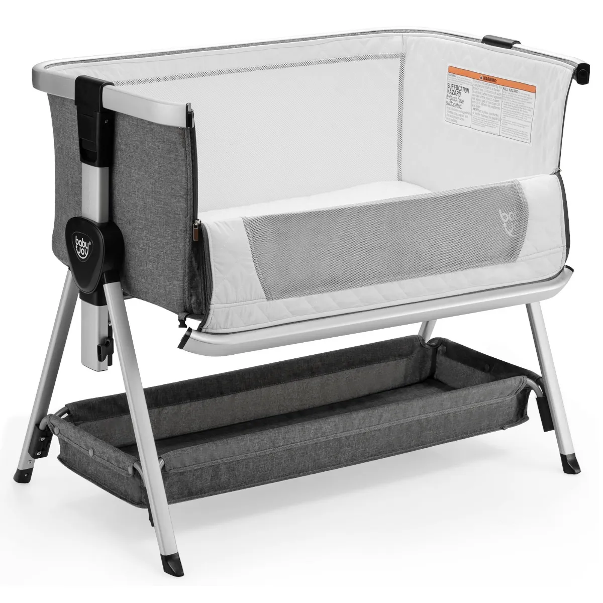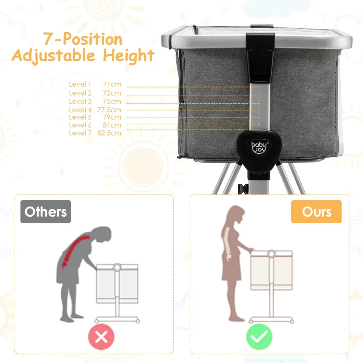 Onze opvouwbare wieg heeft een ergonomisch ontwerp dat uw baby veel comfort biedt. Samengesteld uit een stevig aluminiumlegering frame en hoogwaardige zachte stof, kan onze baby wieg een comfortabele en warme plek voor uw kleintje om te rusten. De verstelbare hoogte van 7 niveaus voldoet aan al uw wensen. Bovendien kunt u de hoogte aan één kant verhogen en uw baby borstvoeding geven om reflux te voorkomen. Dankzij de flexibele wielen aan de onderkant kun je de wieg gemakkelijk verplaatsen. De grote opbergmand op de bodem is handig voor het opbergen van voedsel of dagelijkse benodigdheden.