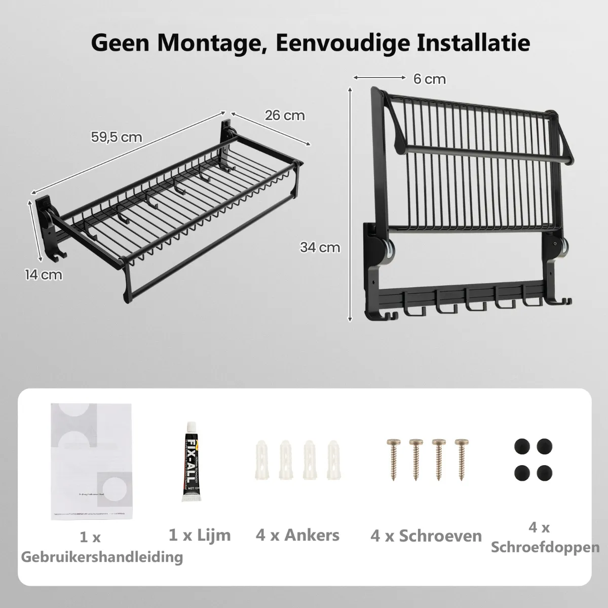 - Verpakking: 1 x Handdoekhouder4 x Schroeven4 x Haken4 x Schroefdeksels1 x Lijm1 x Handleiding