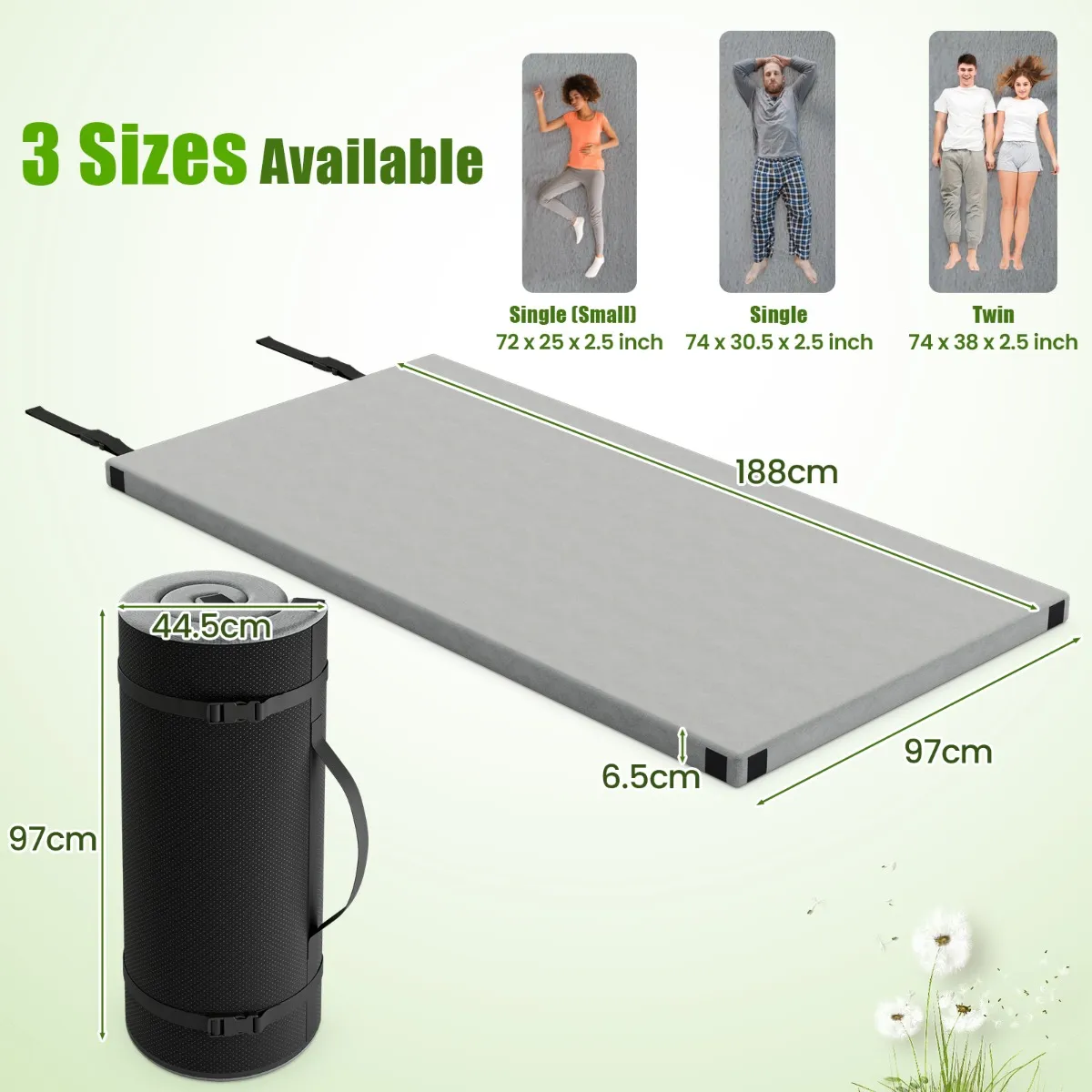 【Verkrijgbaar in 2 maten】: Deze buitenkampeermat is verkrijgbaar in 2 verschillende maten. U kunt kiezen tussen een enkele 188 x 78 x 6,5 cm (L x B x D) of een dubbele 188 x 92 x 6,5 cm (L x B x D), afhankelijk van uw behoeften.