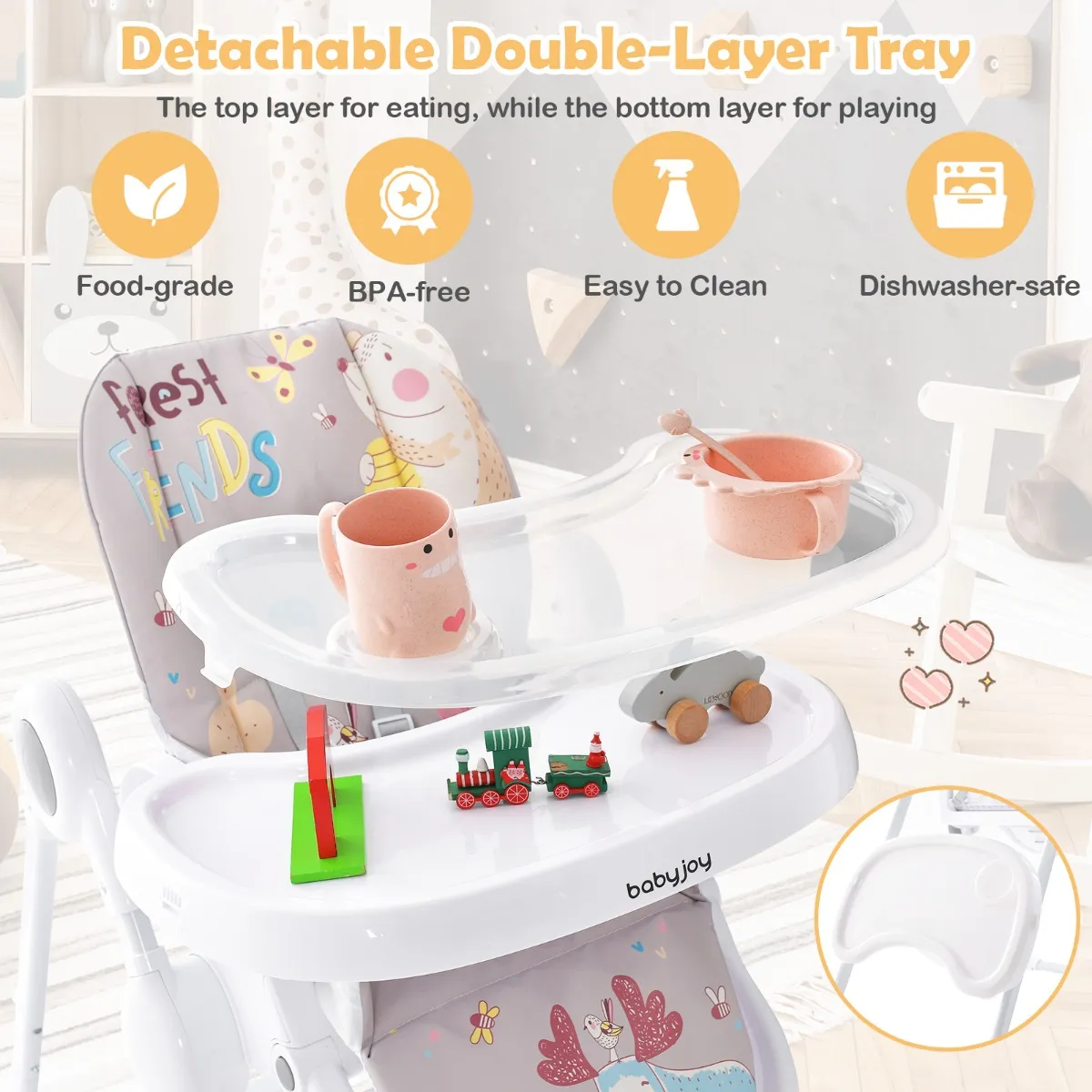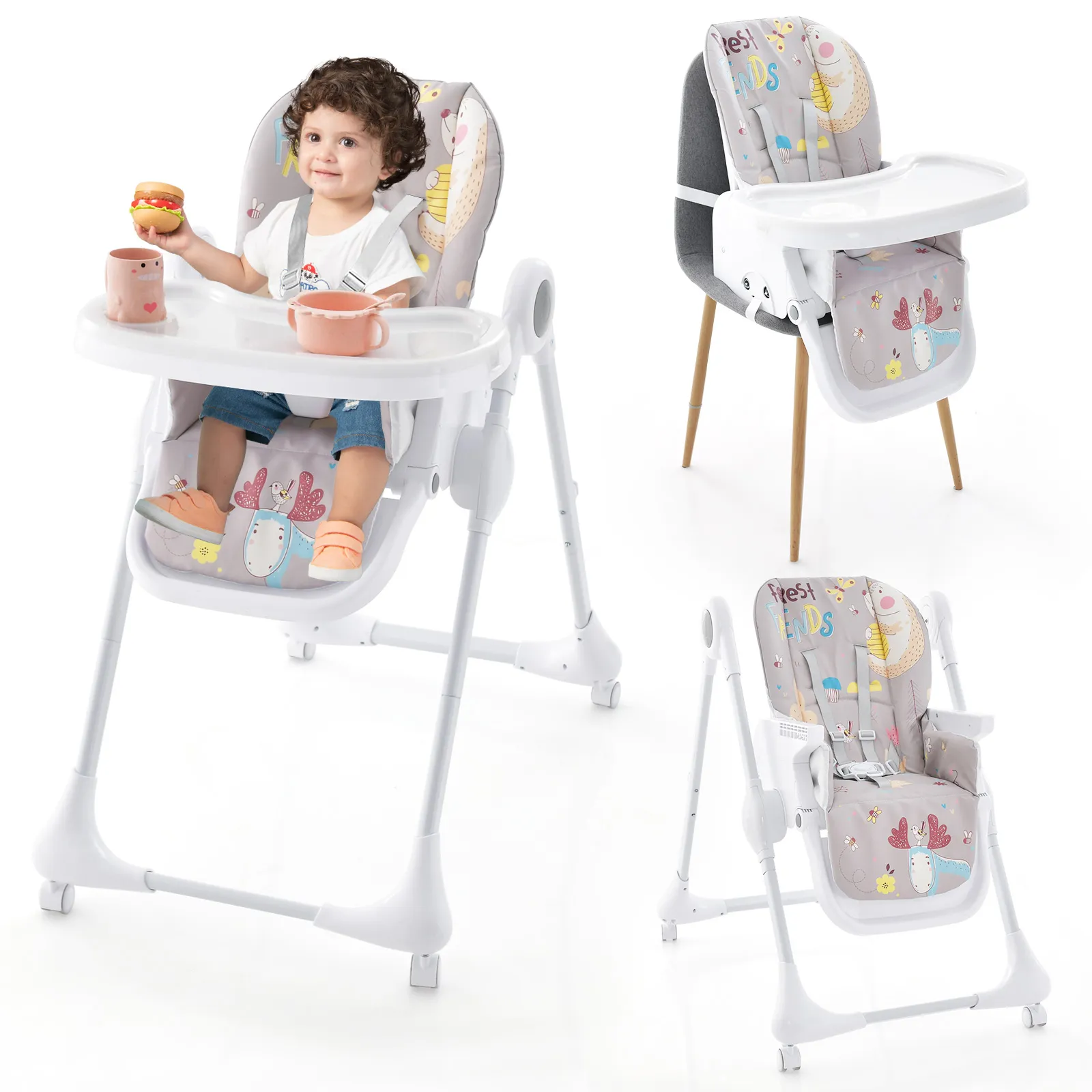 Onze kinderstoel met in 3 standen verstelbare rugleuning en in 5 standen verstelbare voetensteun helpt je de beste positie voor je baby te vinden. Hij is ontworpen met 7 in hoogte verstelbare standen. Bovendien wordt hij geleverd met 1 verwijderbaar dubbellaags dienblad met 3 verstelbare lengtes. Er zijn ook 4 wielen met remmen, zodat ouders hem moeiteloos kunnen verplaatsen. Tips: De wielen kunnen worden verwijderd. Na gebruik kun je op de knoppen drukken om hem compact op te vouwen, zodat je hem makkelijk kunt opbergen.