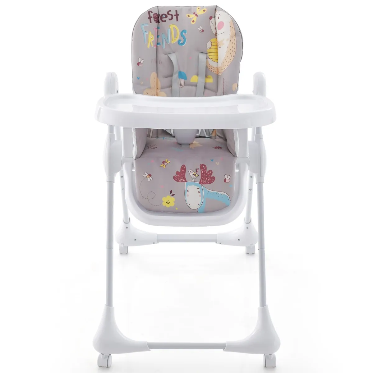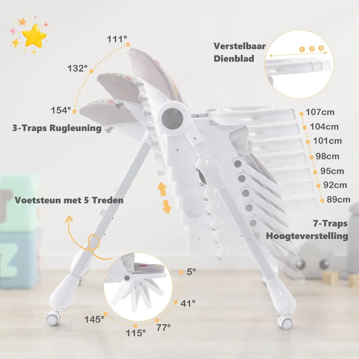 Verstelbare kinderstoel: Onze kinderstoel heeft een rugleuning met 3 hoeken (111°, 132°, 154°), een dienblad met 3 standen en een in 5 richtingen verstelbare voetensteun om te voldoen aan de behoeften van baby’s in verschillende groeistadia. Bovendien kun je de stoel in hoogte verstellen in 7 standen, zodat hij meegroeit met je kleintje.
