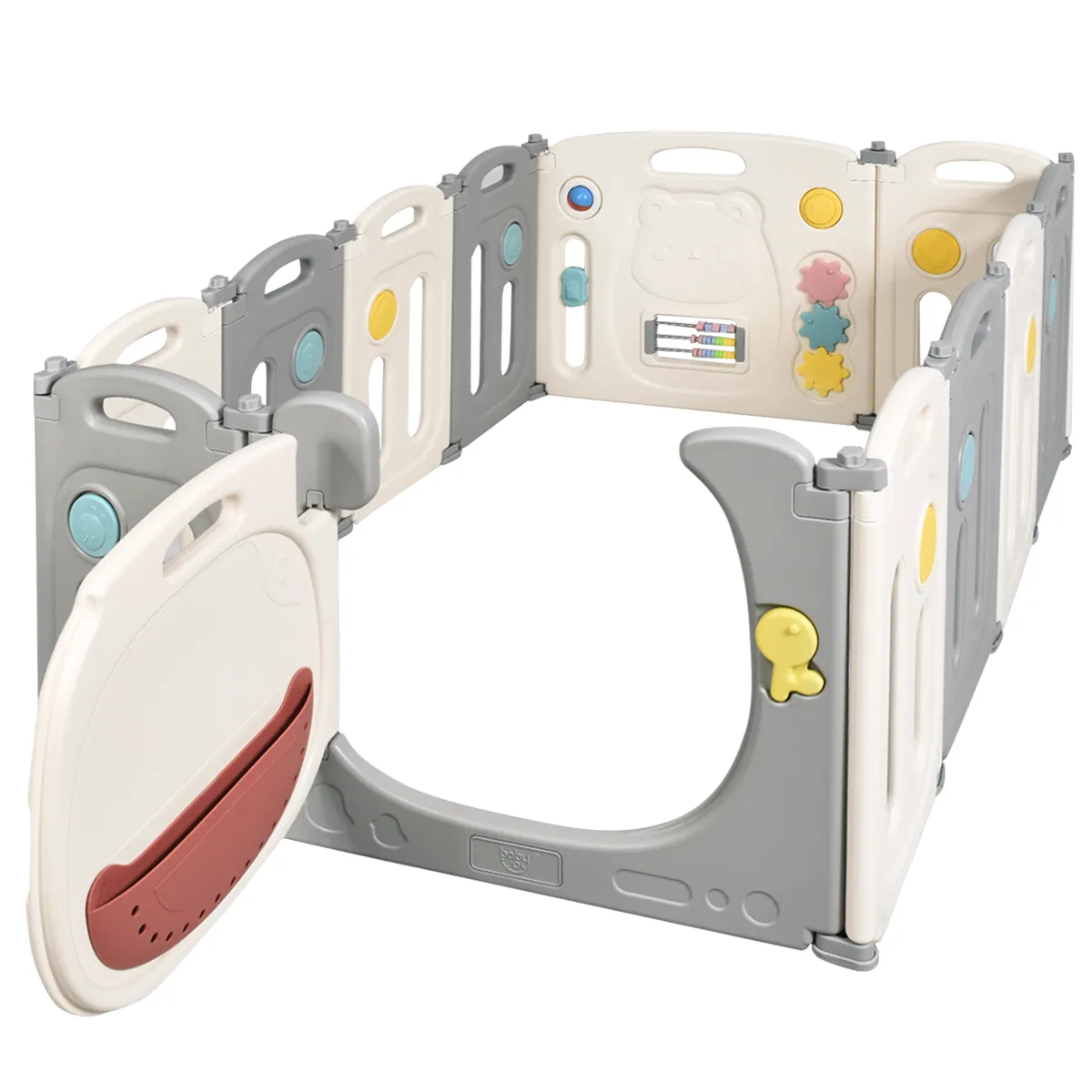 【Spelbord & Veiligheidsslot】Het speelgoed paneel is niet alleen interessant maar ook leerzaam, wat zeer geschikt is voor de baby. De gekleurde telraam, draaitafel, draaiende bal en BB-geluidsknop kunnen de nieuwsgierigheid van uw baby opwekken. Een walvisvormig veiligheidsslot voorkomt dat de baby de deur opent en uit de omheining rent.