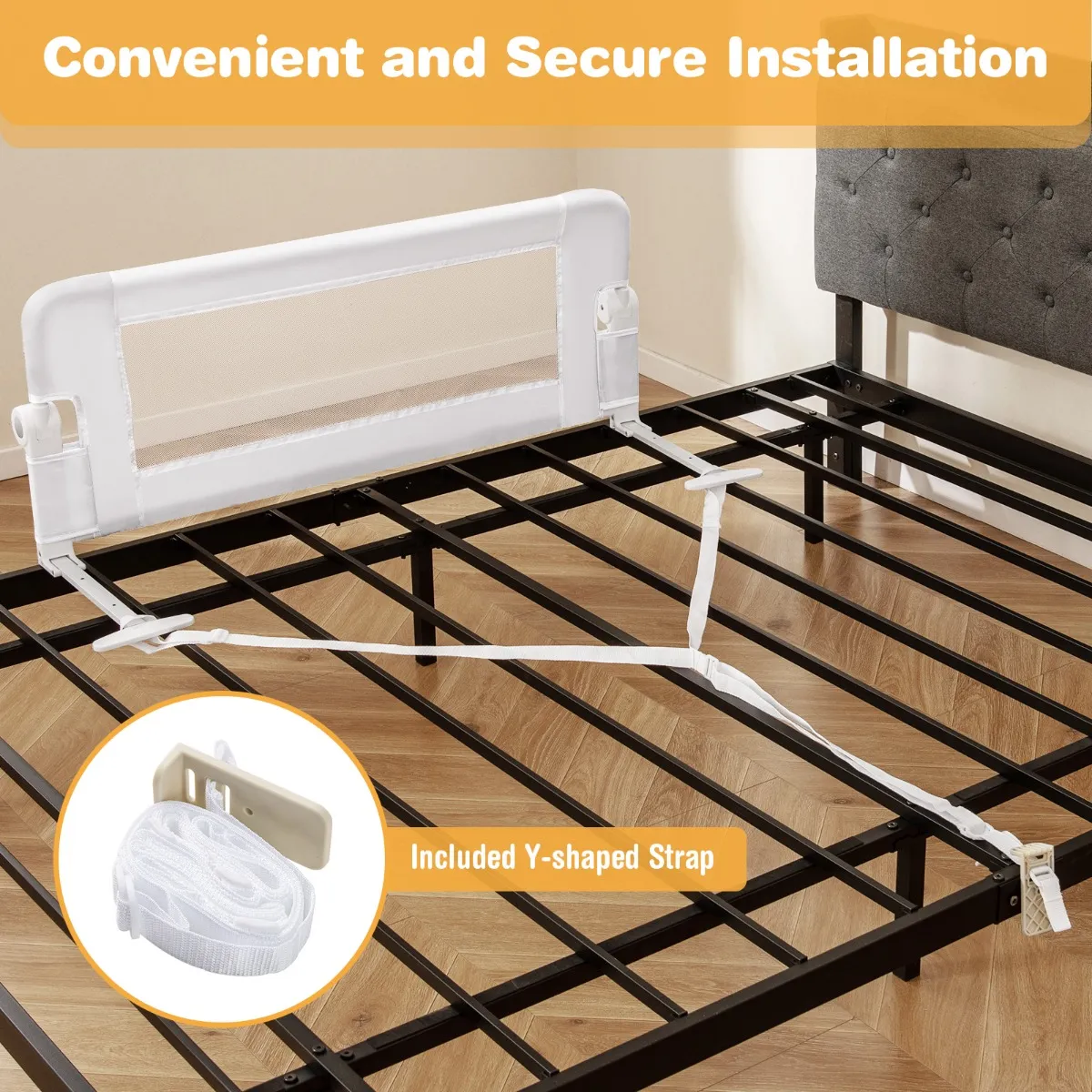 Eenvoudige en moeiteloze installatie: Dit neerklapbare kinderbedhekje is zeer eenvoudig te monteren. Je hoeft alleen beide steunpoten onder de matras te schuiven, de meegeleverde Y-vormige riem onder de matras vast te trekken en de schijf aan de andere kant te bevestigen. Â