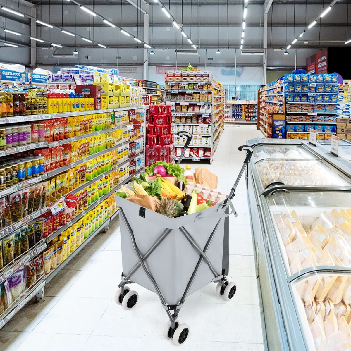 Deze inklapbare handkar is een goede hulp bij het winkelen! Deze winkelwagen met waterdichte en wasbare binnenvoering wordt ondersteund door het robuuste metalen frame met stabiele X-vormige constructie en biedt plaats aan verschillende levensmiddelen. In de tussentijd beschikt de liner over een passende afdekking ter bescherming van de privacy. De stille en schokbestendige wielen en de gripvaste handgrepen maken het schuiven moeiteloos. Als je deze winkelwagen niet nodig hebt, vouw je hem gewoon in en plaats hem ruimtebesparend aan de muur.