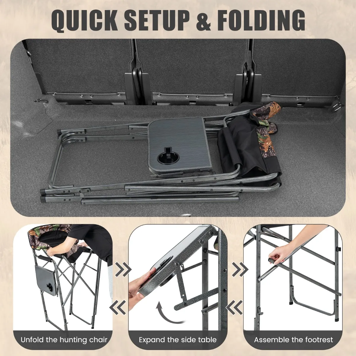 【Opvouwbare bijzettafel】 Met een inklapbare bijzettafel biedt de outdoor-campingstoel een praktische plaats voor je benodigdheden zoals verrekijker, munitie of jachtwapens. Daarnaast heb je met de meegeleverde bekerhouder altijd toegang tot je dranken.