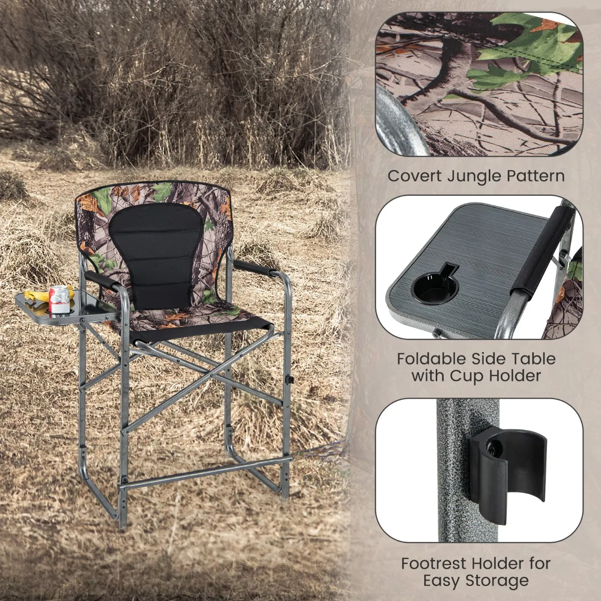 Ontworpen met camouflagepatroon, valt de campingstoel minder op prooi en is daarom een perfecte keuze voor de jacht. Bovendien verhoogt de ruime zitting je comfort aanzienlijk. En de voetensteun biedt extra ondersteuning en ontspanning. Met een verhoogd design en superieur comfort kun je met de opvouwbare campingstoel tijdens lange jachtsessies geconcentreerd en geduldig blijven. Bovendien zul je het gemak van de inklapbare zijtafel weten te waarderen. En de aangebrachte bekerhouder is perfect om je drankjes binnen handbereik te hebben. Bovendien is de extra grote campingstoel gemakkelijk op te vouwen en dus draagbaar voor verschillende gelegenheden zoals wandelen, kamperen, picknick en jagen.