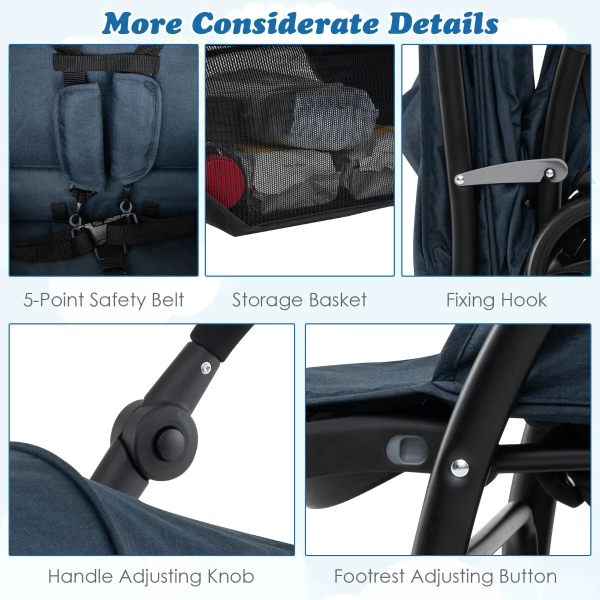 【Oudervriendelijk ontwerp】 De duwbeugel is verstelbaar om aan de verschillende eisen van ouders te voldoen, zodat ze hem comfortabeler kunnen vastpakken. De mand onder de zittingen geeft ouders extra ruimte voor babyaccessoires. En als je de kinderwagen niet gebruikt, kan hij snel worden ingeklapt tot een compact formaat voor eenvoudig opbergen en vervoeren.