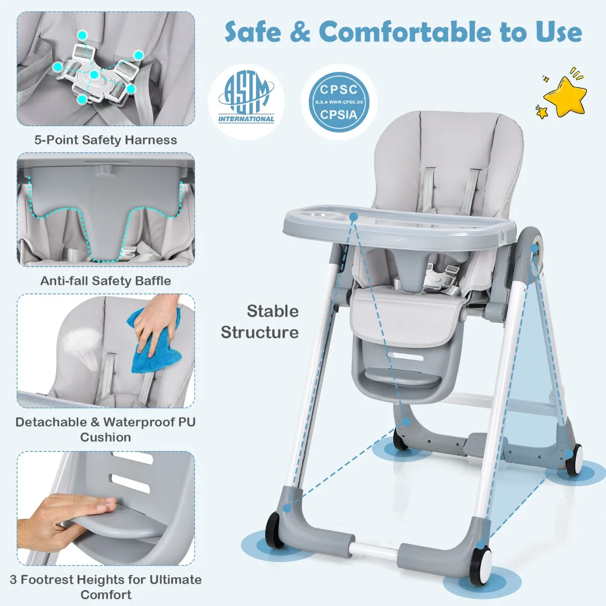 Onze opvouwbare kinderstoel heeft een rugleuning met 5 standen, 7 hoogtes voor verschillende tafels, een voetensteun met 3 standen en 3 hoogtes voor comfort. Het afneembare eet- en speelblad heeft 3 standen voor verschillende behoeften. Hij is ontworpen met een stabiele driehoekige structuur, een 5-punts veiligheidsharnas en gladde randen voor de veiligheid. Het gevoerde kussen is comfortabel en de afneembare PU-leren bekleding is gemakkelijk schoon te maken. De 4 wielen maken het gemakkelijk om rond te rijden en het remsysteem is praktisch.