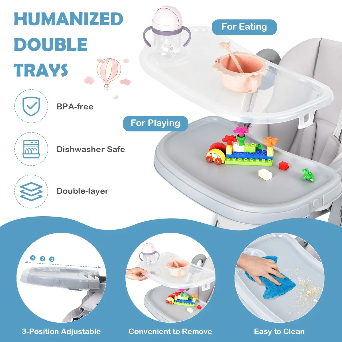 Afneembare dubbele plateaus met 3 standen: Deze kinderstoel heeft een afneembaar dubbel plateau: het bovenste plateau is geschikt voor voeding, terwijl het onderste plateau veel ruimte biedt voor baby om te spelen. De plateaus hebben 3 posities om ze heen en weer te bewegen. Ze zijn gemaakt van hoogwaardig PP-materiaal, veilig voor kinderen en gemakkelijk schoon te maken met een vochtige doek.