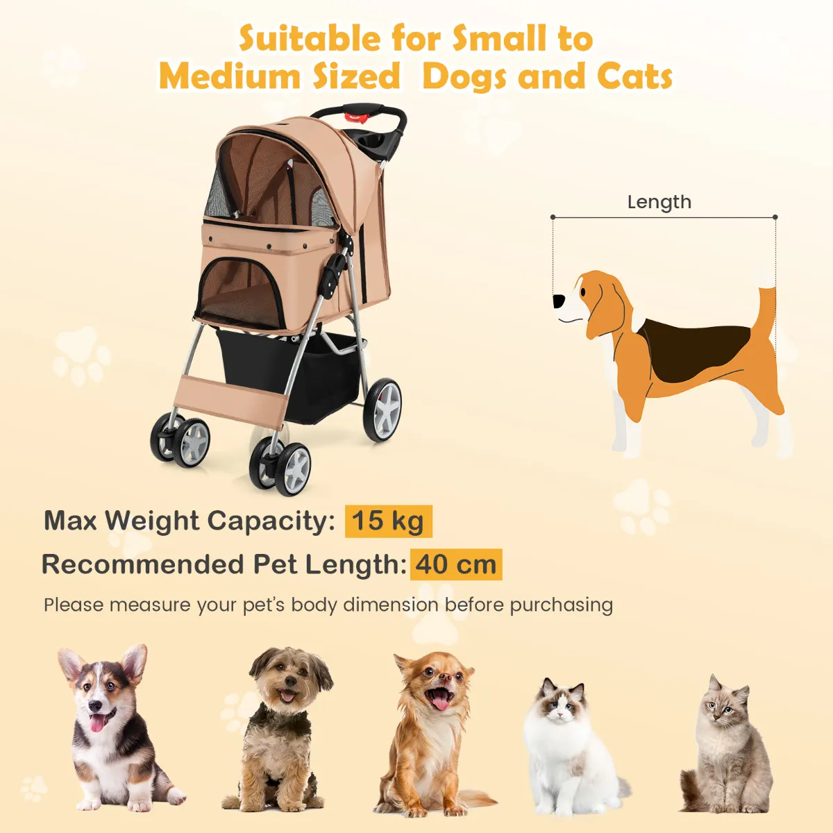 【Gemakkelijk vervoer】Deze draagbare dierenwagen met eenhandig vouwontwerp is ideaal voor reizen en kamperen, waar huisdieren tot 40,5 cm lang in passen. U kunt hem opvouwen tot een compact formaat voor eenvoudige opslag en vervoer. Opgevouwen formaat: 46 x 27 x 89 cm