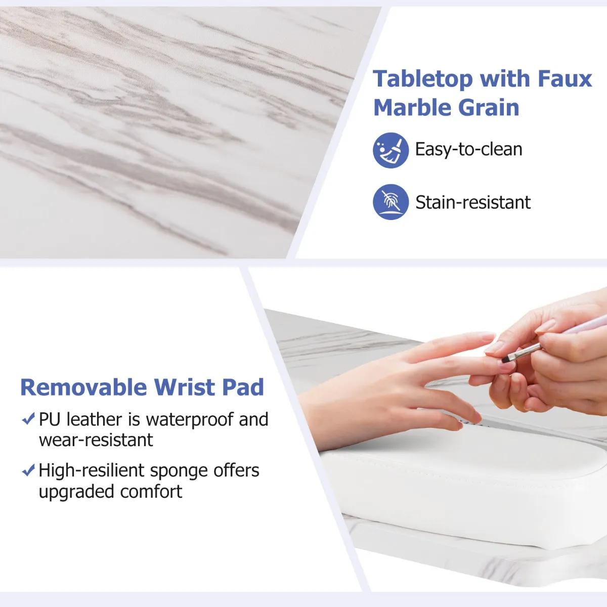 【Stijlvol en comfortabel werkstation】: De nagelkunsttafel heeft een elegant imitatiemarmeren blad, dat de stijl van uw spa, salon of huis verbetert. Bovendien wordt de opvouwbare manicuretafel geleverd met een afneembaar polskussentje, dat is opgevuld met een dikke spons voor optimaal comfort.