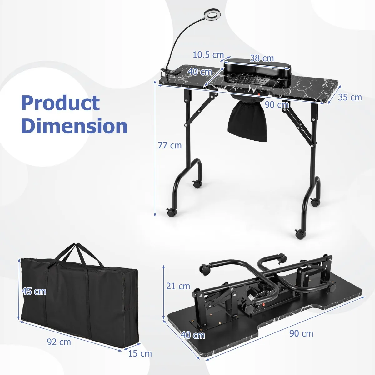 De opvouwbare manicuretafel is uitgerust met een elektrische stofafzuiger en 3 stofzakken. Hierdoor kan hij effectief stofdeeltjes opvangen en opvangen tijdens het vijlen en vormen van nagels. Zo creëert u een gezondere omgeving voor u en uw klanten. De flexibele LED-lamp beschikt over 3 instelbare kleurtemperatuurniveaus en 10 helderheidsniveaus en biedt optimale lichtomstandigheden voor gedetailleerde nail art-ontwerpen. Wordt geleverd met 4 vergrendelbare, universele wielen, waardoor de nagelsalontafel eenvoudig naar elke gewenste plek verplaatst kan worden. Aarzel niet!