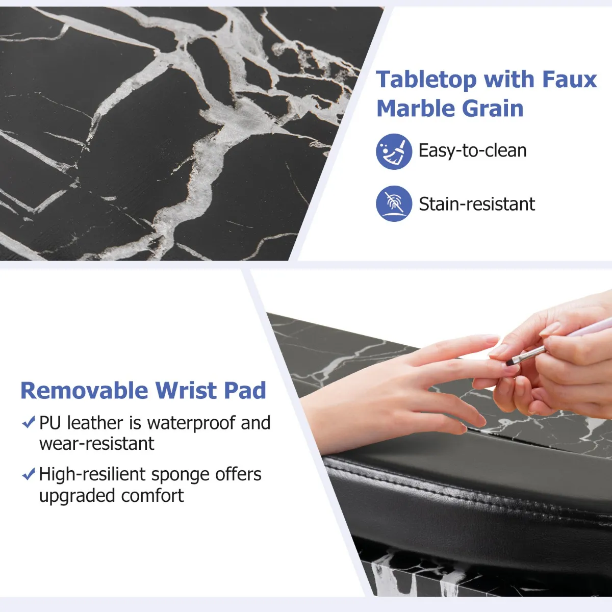 【Stijlvol en comfortabel werkstation】: De nagelkunsttafel heeft een elegant imitatiemarmeren blad, dat de stijl van uw spa, salon of huis verbetert. Bovendien wordt de opvouwbare manicuretafel geleverd met een afneembaar polskussentje, dat is opgevuld met een dikke spons voor optimaal comfort.