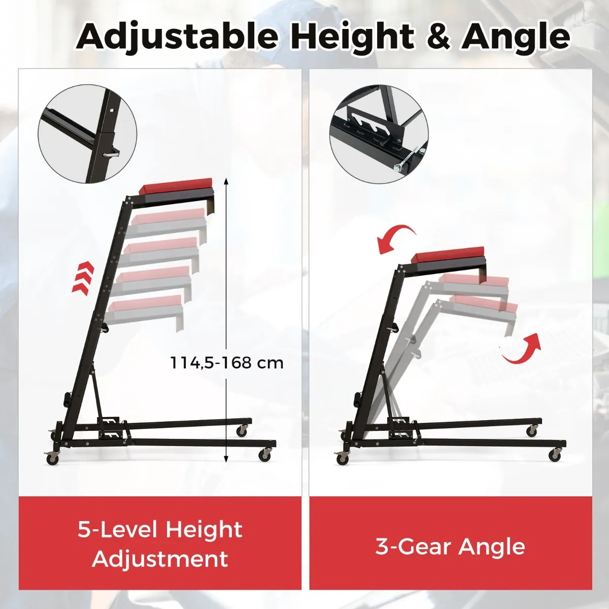In hoogte en hoek verstelbaar : Deze hoge trapladder is in 5 standen in hoogte verstelbaar van 114,5 tot 168 cm, geschikt voor voertuigen van verschillende afmetingen. En met de hoekinstelling met 3 snelheden kun je een comfortabele houding aanhouden met extra gemak.