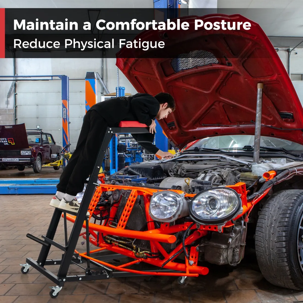 Zeer compatibel : Deze functionele autotrap met flexibele verstelling en hoog draagvermogen maakt het gemakkelijk om verschillende soorten voertuigen te repareren, zoals JEEP’s, bestelwagens en vrachtwagens.