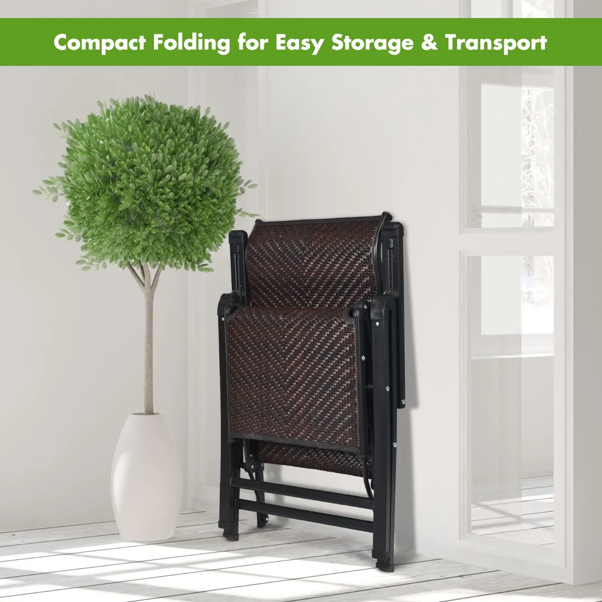 Deze ligstoel van rotan is een goede keuze voor een ontspannen middag buiten, als je op zoek bent naar een goed uitziende en functionele stoel. Bestaande uit hoogwaardig PE-rotan en een stevig stalen frame, is hij uiterst robuust, duurzaam en kan het hele jaar door worden gebruikt. Bovendien kan de helling van de ergonomische rugleuning naar behoefte worden aangepast door het verplaatsen van de armleuningen. De voetkappen zorgen voor een hoge stabiliteit en slipweerstand. Door het inklapbare en lichte ontwerp kan de stoel gemakkelijk worden gedragen en op het terras, het balkon, in de tuin of op kantoor worden neergezet. Ontspan met onze rotanstoel.