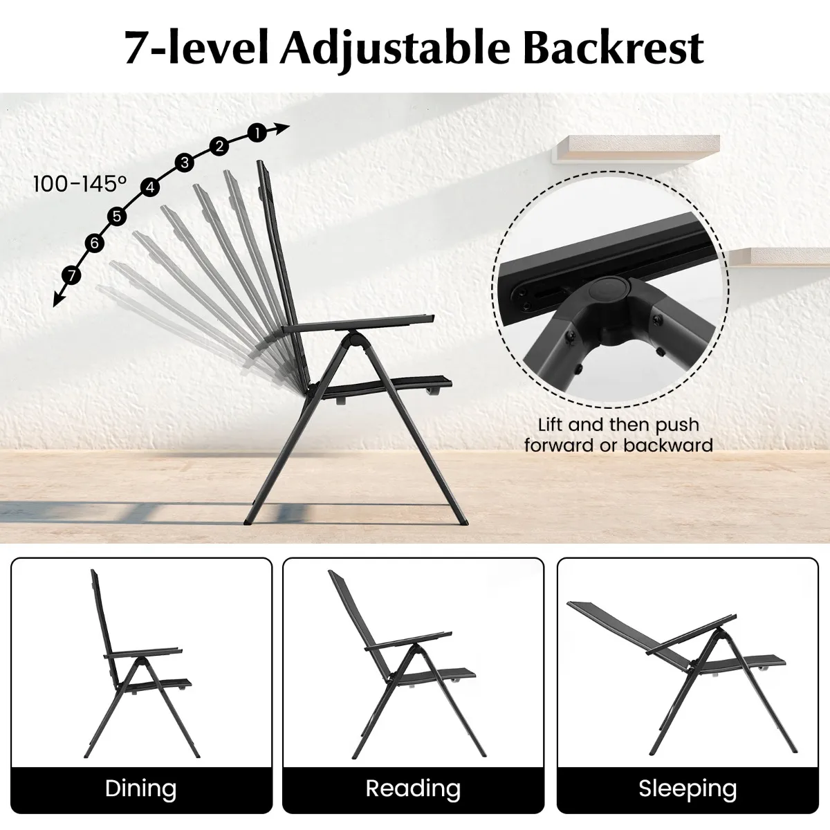 Rugleuning verstelbaar in 7 standen: Met 7 verschillende standen passen de draagbare terrasstoelen zich aan jouw voorkeuren aan. Of je nu helemaal wilt gaan liggen in een ontspannen hoek van 145° of rechtop wilt zitten in een comfortabele hoek van 100°, je kunt gemakkelijk je ideale positie vinden om te eten, lezen of slapen.