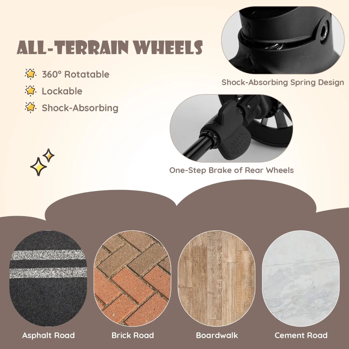 【Hoogwaardige EVA-wielen】Gemaakt van hoogwaardig EVA, de achter- en voorwielen zijn draagbaar en schokbestendig en passen goed bij verschillende soorten terrein, zoals asfalt-, baksteen- en cementwegen. Bovendien kunt u het voorwiel in één richting vergrendelen of ontgrendelen voor een rotatie van 360°.