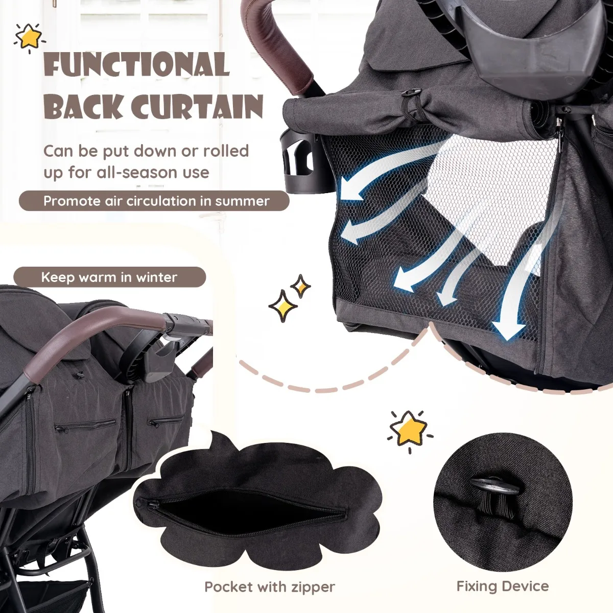 【Gehumaniseerd ontwerp】Deze kinderwagen met oprolbare gordijnen aan de achterkant is ideaal voor gebruik het hele jaar door. Het vak met ritssluiting aan de achterkant, het onderrek en de bekerhouder bieden voldoende opbergruimte. Bovendien bevordert het kleine venster de luchtcirculatie, zodat u uw baby’s in de gaten kunt houden. En door hem met slechts één druk op de knop op te vouwen, is hij gemakkelijk op te bergen of mee te nemen.