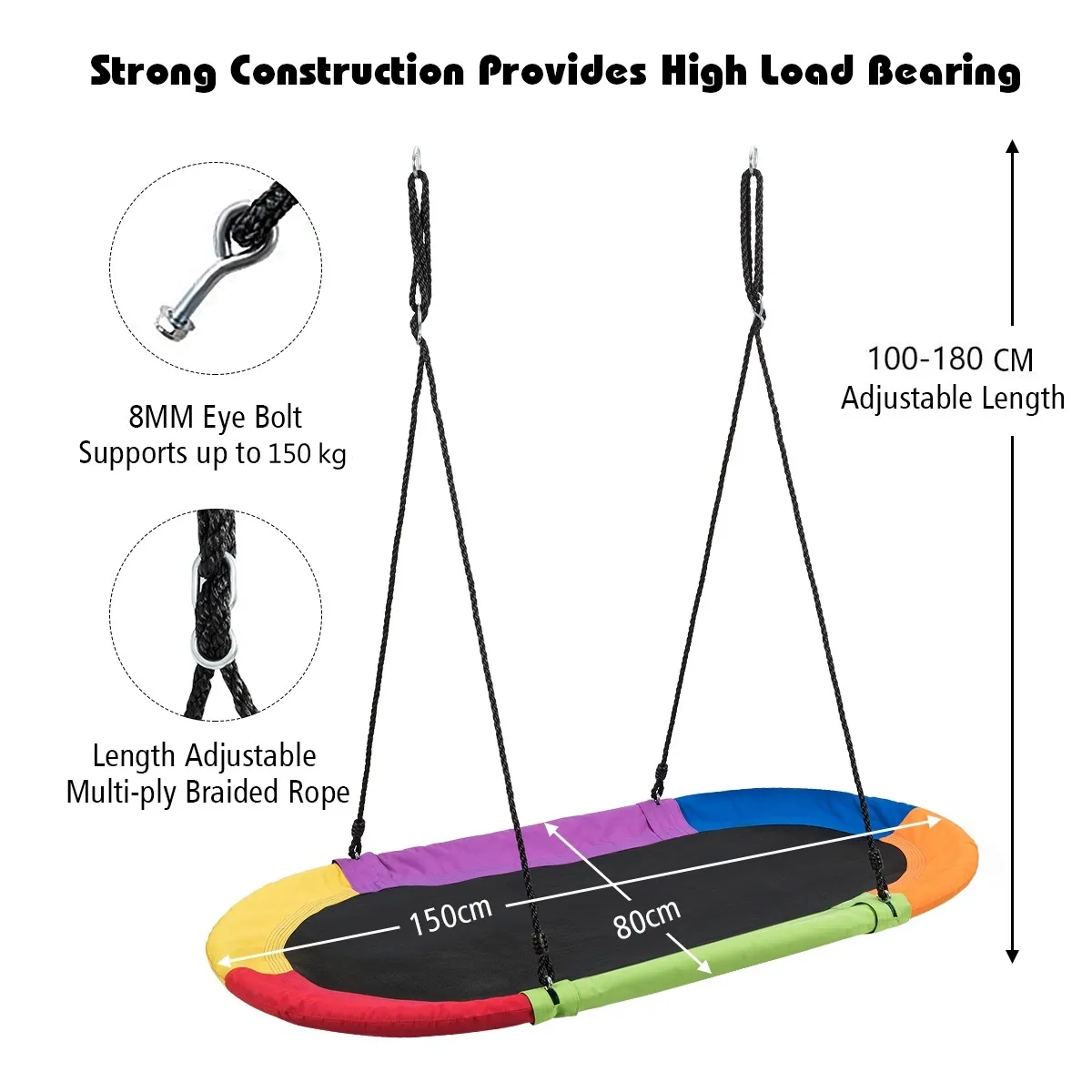 Deze ovale schommel is gemaakt van hoogwaardige materialen, die stevig en duurzaam zijn. Met het verstelbare schommeltouw op 100-180 cm, is deze schommel geschikt voor verschillende locaties en ruimtes van verschillende afmetingen. Met een gewichtscapaciteit van 150 kg en een reusachtige ruimte van 150 cm, is hij ruim genoeg voor meerdere kinderen om samen te schommelen en te spelen! De schommel biedt een ontspannende plek voor u en uw kinderen om te spelen, te lezen, naar muziek te luisteren. En het helpt kinderen ook om vriendschap op te bouwen en bevordert de ouder-kind interactie. Bovendien kunt u met deze schommel niet alleen het plezier van het vliegen ervaren, maar ook uw lichaam en evenwichtsvaardigheid opbouwen.