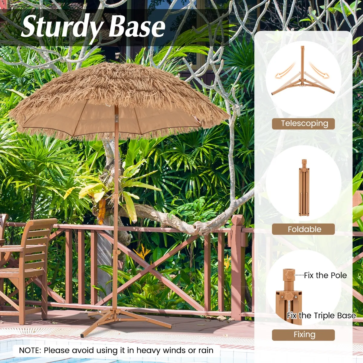 【Sfeer in Hawaïaanse stijl】: De luifel heeft een weerbestendige buitenkant van riet en een ademende binnenkant van polyesterstof, die een betere bescherming tegen de zon biedt voor langdurig buitengebruik. Bovendien geeft het kunststro het gevoel en de sfeer van een Hawaïaans strand.