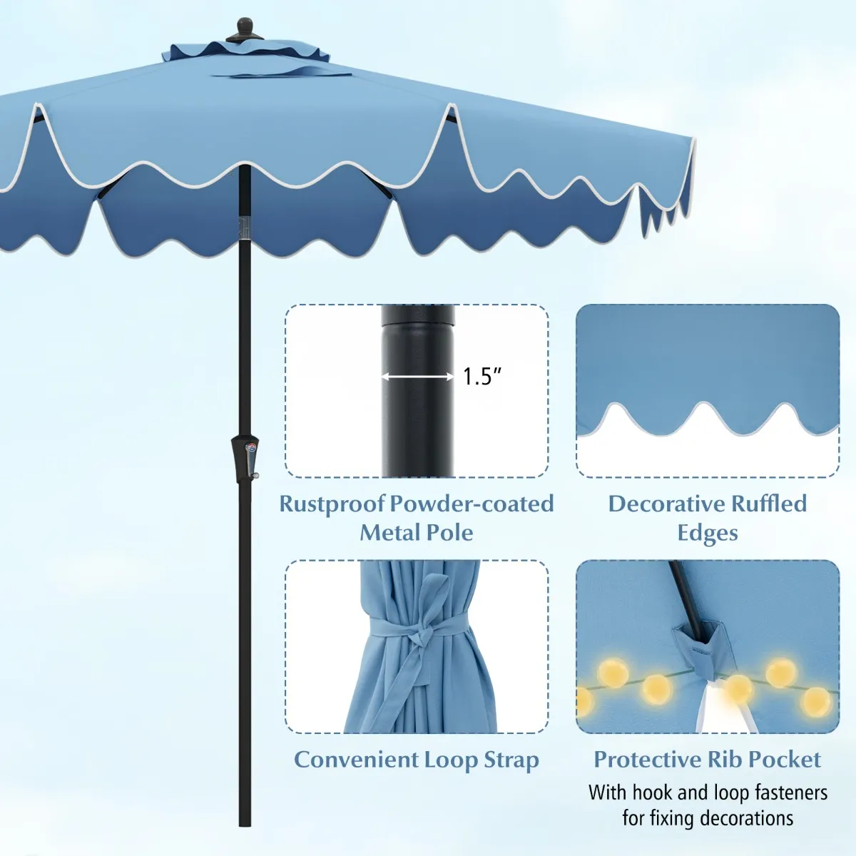 【Elegant en modieus uiterlijk】: Deze parasol meet 271 x 244 cm (diameter x hoogte) en biedt jou en je dierbaren veel schaduw om buiten te ontspannen. Hij valt op door de decoratieve geplooide randen, die hem een vleugje elegantie geven. Tot slot is hij uitgerust met klittenbandsluitingen voor het bevestigen van decoraties.