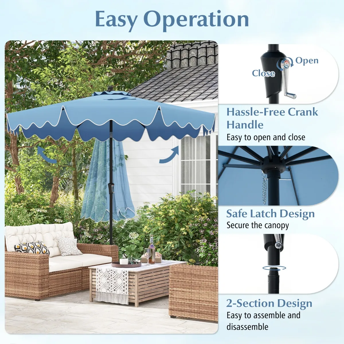 Onze 270 cm grote terrasparasol biedt royale bescherming voor een aantal meubels en is ideaal om een gezellige plek te creëren voor ontspannen dagen met je dierbaren. Of je nu in de tuin wilt grillen, bij het zwembad wilt ontspannen of buiten wilt eten. Het polyester dak biedt niet alleen een betere bescherming tegen de zon, maar het kantelbare ontwerp maakt het ook mogelijk om de hele dag door van optimale schaduw te genieten. Bovendien beschikt hij over een zwengel, waarmee de parasol heel eenvoudig kan worden geopend en gesloten. En dankzij het veilige vergrendelingsontwerp hoef je je geen zorgen te maken dat de paraplu plotseling sluit. Deze paraplu is met name versierd met ruches en je kunt decoratieve accenten op de beschermende ribzakken aanbrengen om je buitenruimte een individuele en verfijnde touch te geven.