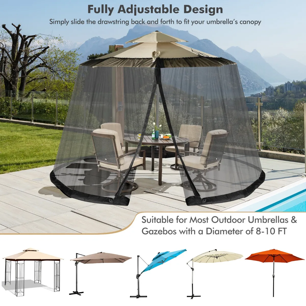 Het parasol muggenetten wordt gemaakt van premium polyester gaas met minder-dan-1 mm diameter, die dicht genoeg is om de “onwelkome gast” buiten te houden met behoud van voldoende zicht. Belangrijker nog, er is een verstelbaar trekkoord aan de bovenkant, die kan worden aangepast aan de patio paraplu 2,5-3 m in diameter te passen. Bovendien is hij uitgerust met 2 deuren met dubbele ritssluiting, zodat u gemakkelijker in of uit het net kunt stappen. En u kunt water of lucht aan de basis waterpijp toevoegen en de mond verzegelen, zodat het net van de parasol dekking een grote windweerstand zou krijgen. Bovendien kan ons paraplu muskietennet worden opgevouwen tot een compact formaat voor gemakkelijk opbergen. Of u nu tijd buiten op uw patio, dek, gazon, veranda, of het hebben van feesten, BBQ in de tuin, kan het een perfecte keuze zijn.