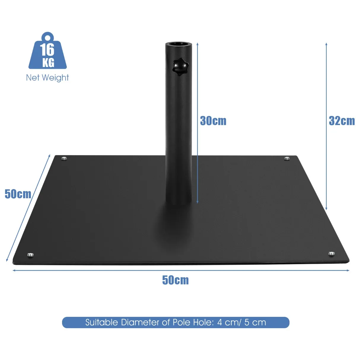 【Stabiele structuur en 4 verstelbare voeten】 De parasolstandaard beschikt over een vierkante basis van 50 x 50 cm (l x b), die het contactoppervlak vergroot en zo voor grote stabiliteit en veiligheid zorgt. Daarnaast is hij uitgerust met 4 verstelbare voetkussens aan de onderkant, die zich aanpassen aan oneffenheden in de vloer en de vloer tegen krassen beschermen.