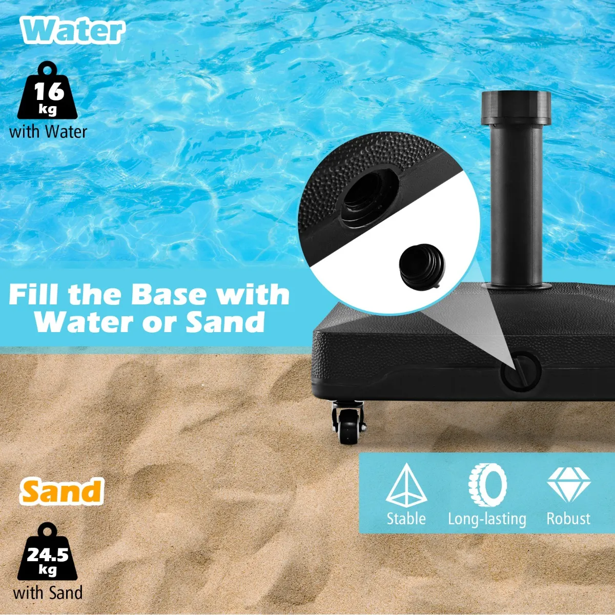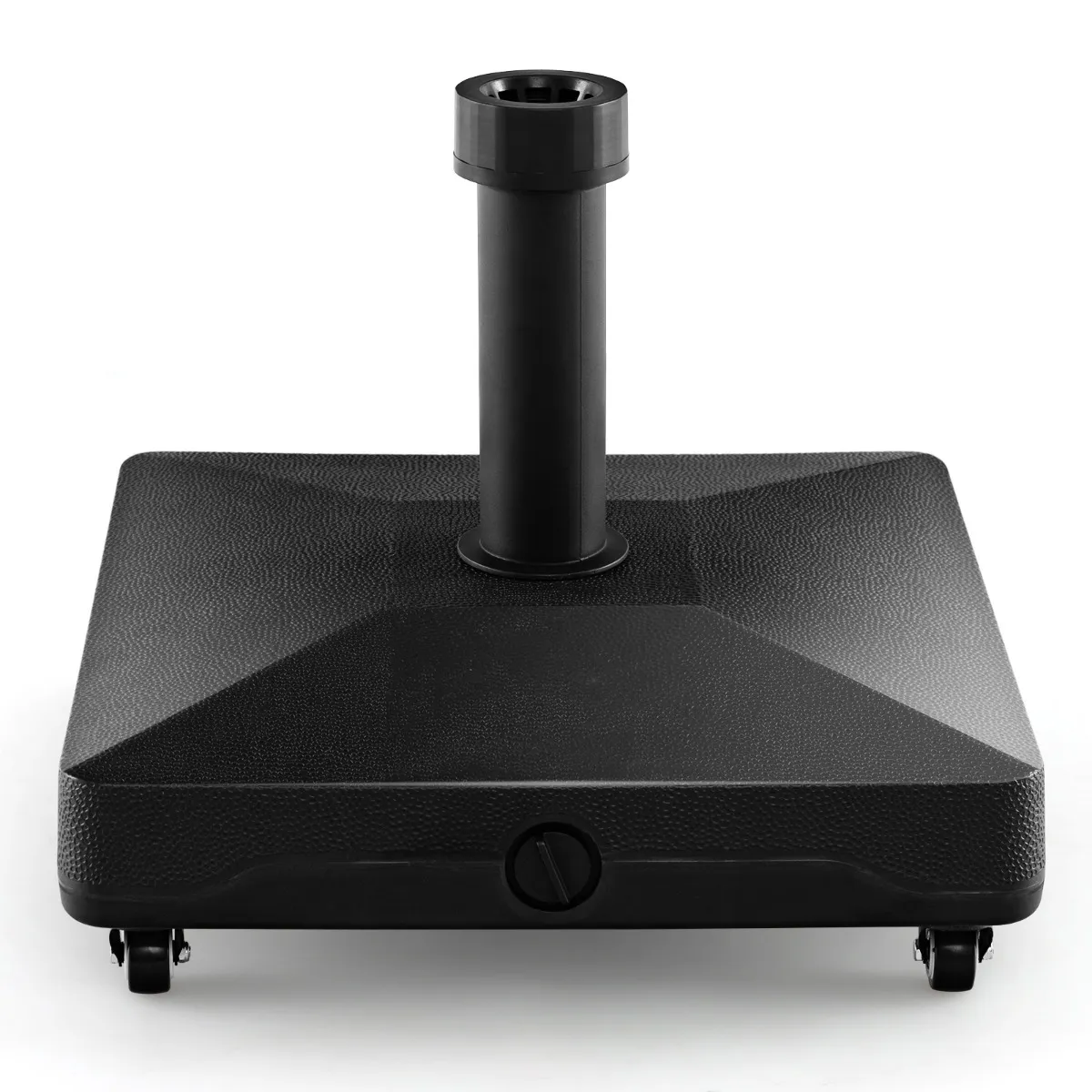 Met 4 universele wielen, waarvan 2 vergrendelbaar zijn, maakt deze mobiele parasolstandaard moeiteloos verplaatsen van de parasol daar waar hij nodig is. Je kunt het navulbare reservoir met water of zand vullen om het gewicht van de parasolstandaard voor een betere stabiliteit te verhogen. Bovendien zorgt de van windbestendige en zware materialen gemaakte vierkante parasolstandaard voor duurzaamheid en betrouwbaarheid in elke buitenomgeving, of het nu op een terras, bij het zwembad, op het dek of op het gazon is.
