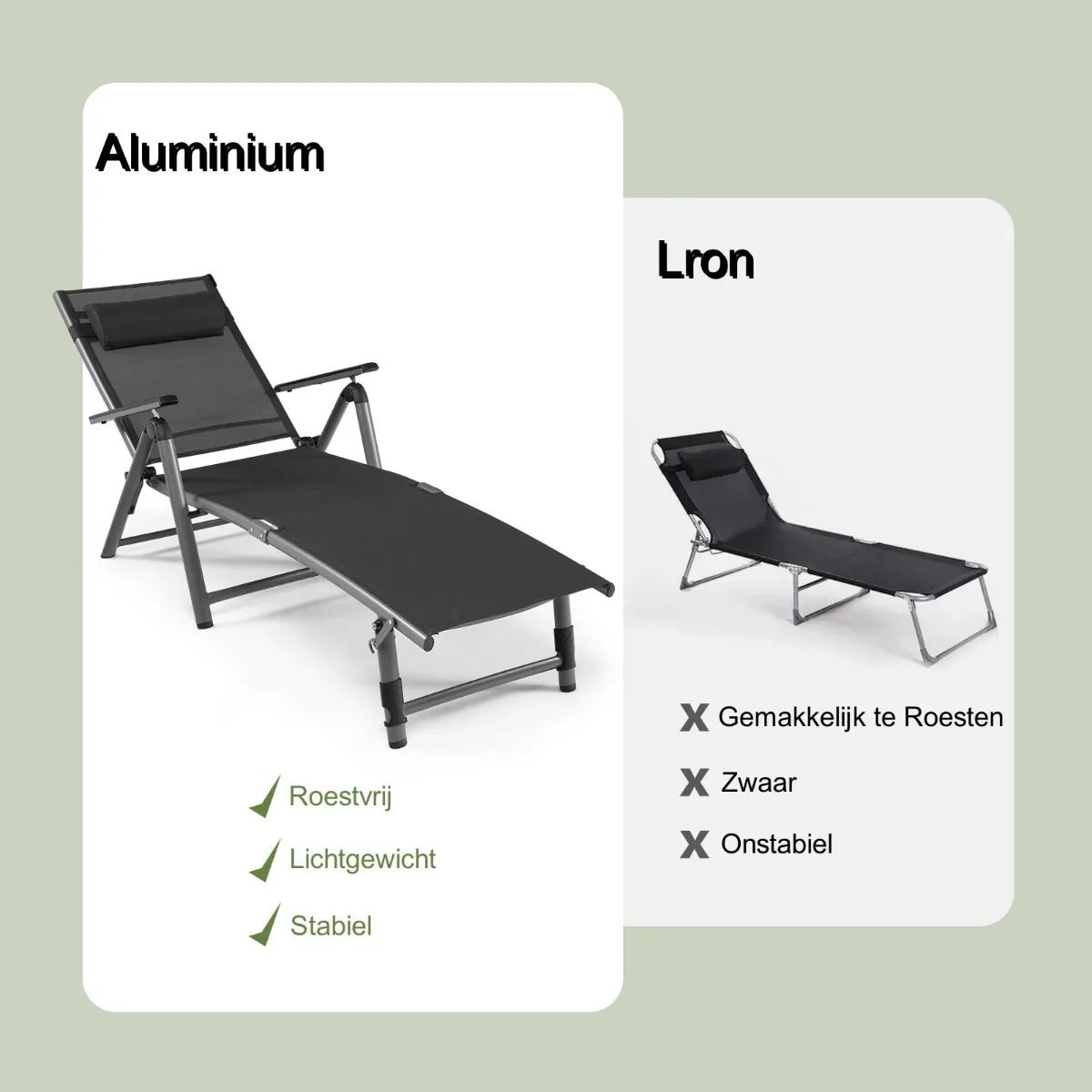 Tijd om te ontspannen na een drukke dag door te gaan liggen op deze aluminium ligstoel voor buiten! Of u nu wilt lezen, zonnebaden of gewoon een dutje wilt doen, onze ligstoel voor buiten is een uitstekende keuze dankzij de 8 verstelbare rug- en 2 pootstanden. In vergelijking met andere soortgelijke producten die zwaar, onstabiel en niet roestbestendig zijn, zal deze terrasligstoel deze problemen nooit hebben omdat hij gemaakt is van een hoogwaardig aluminium frame. Wat de gebruikerservaring betreft, bedekt het ademende en sneldrogende materiaal de hele zitting voor ultiem comfort. En het verstelbare kussen kan uw hoofd of lendenwervelkolom ondersteunen volgens uw voorkeur. Je kunt het ook verwijderen. Wanneer u deze ligstoel voor buiten niet nodig hebt, kunt u hem eenvoudig inklappen en opbergen.