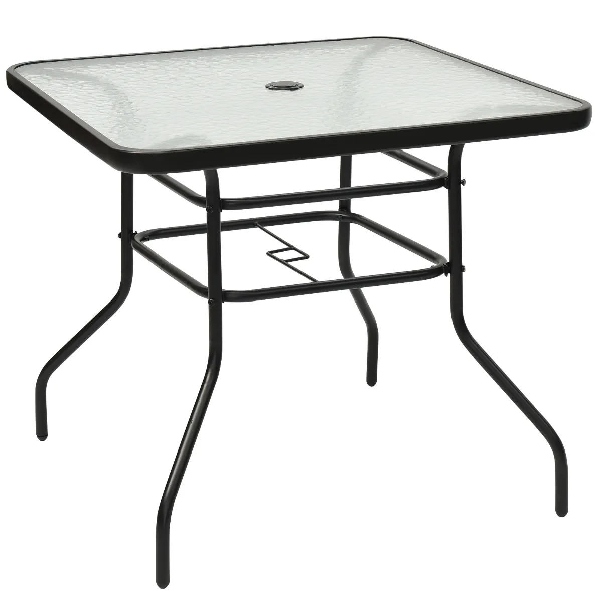 Het gepoedercoate zwarte stalen frame is duurzaam en stabiel, met een draagvermogen tot 80 kg. Het tafelblad van gehard glas droogt snel en is ideaal voor een familiebijeenkomst. In het midden is er een gat voor parasols, waardoor je ook op warme dagen buiten van je koffie kunt genieten. De salontafel is geschikt voor tuinen, terrassen en andere buitenruimtes.