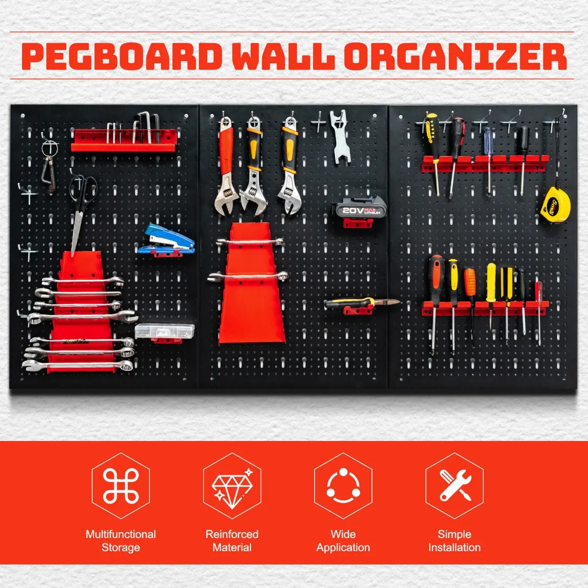 Gemaakt van poeder-gecoat en koudgewalst staal, de pegboard organisator is stevig en gebouwd om lang mee te gaan. Een verscheidenheid van haak types zijn voorzien voor u om te kiezen, perfect voldoen aan uw verschillende behoeften. Dit veelzijdige pegboard zal veel ruimte vrijmaken in uw kelder, werkplaats en garage en houdt ze schoon en netjes. De installatie onderdelen zijn allemaal inbegrepen en de installatie is eenvoudig genoeg voor één persoon om te doen.Dit gereedschap pegboard zal u veel gemak brengen en een goede helper worden tijdens uw werk.