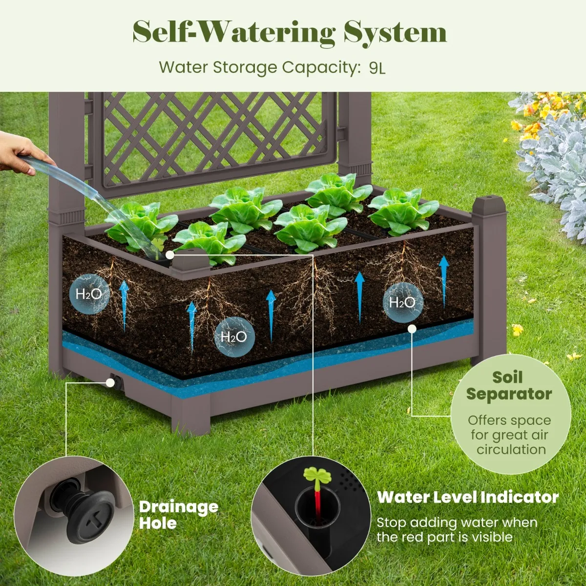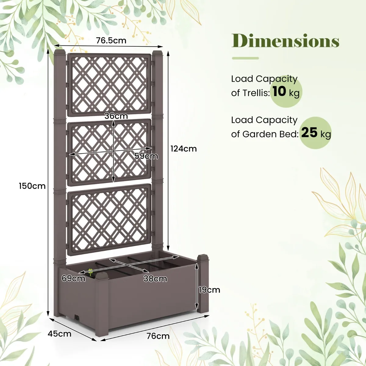 Het 3-voudig in hoogte verstelbare traliewerk is geschikt voor klimplanten zoals komkommers en klimop op een hoogte van 150 cm, 113 cm en 76 cm. Het geïntegreerde zelfbewateringsmechanisme van 9 liter, voorzien van een transparante waterniveau-indicator en een grondafscheider, voedt de planten en voorkomt wortelrot. Een efficiënt afvoersysteem gaat het overstromen van water tegen. De plantenbak van PP met de afmetingen 76 cm L x 45 cm B x 150 cm H en traliewerk is splintervrij en lichtbestendig. Het gereedschapsloze ontwerp zorgt voor een probleemloze montage. Geef dit cadeau voor tuinliefhebbers!