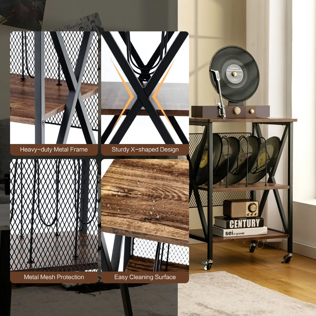 De bovenkant van de kast is een perfect platform om uw platenspeler op te plaatsen. Wat duurzaamheid en stevigheid betreft, garandeert de combinatie van technisch hout en een massief stalen frame u een product dat u heel lang zal bijblijven. Dankzij de 360 graden verschuifbare wielen kunt u zich comfortabel en stil verplaatsen op verschillende soorten vloeren. Bovendien kunnen de 2 wielen met rem deze platenspeler standaard vastzetten en zijn stabiliteit verbeteren. Het kan worden gebruikt als een album organizer, nachtkastje en bijzettafel in zowel de woonkamer als de slaapkamer.