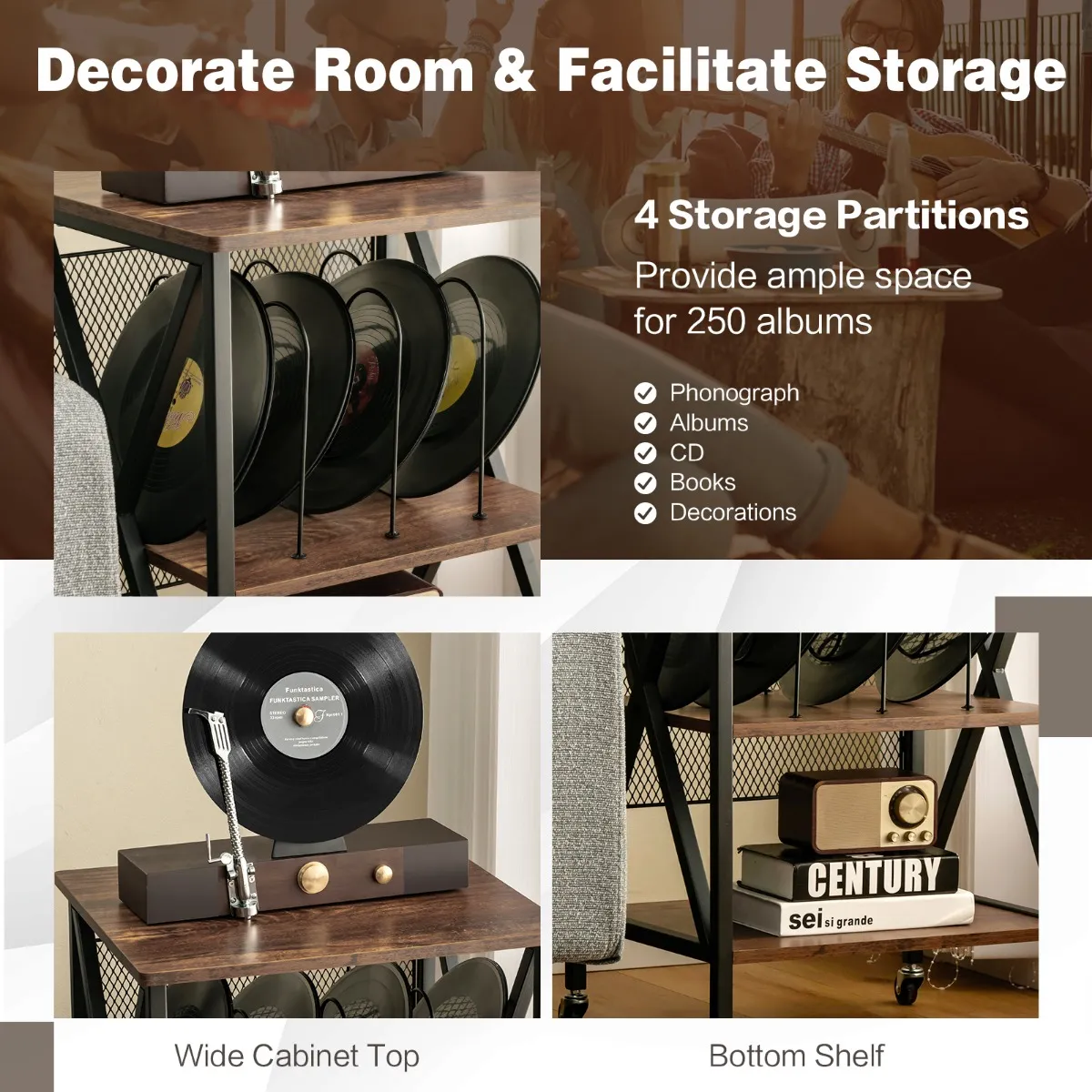 Doordacht ontwerp: Het vinyl platenrek heeft 3 verdelers voor voldoende opslag- en displayruimte voor 250 albums. De bovenkant van de kast meet 52 x 45 cm, ruim genoeg voor de platenspeler. Daarnaast kunnen vinylplaten, cd’s en boeken op de onderste plank worden opgeborgen.