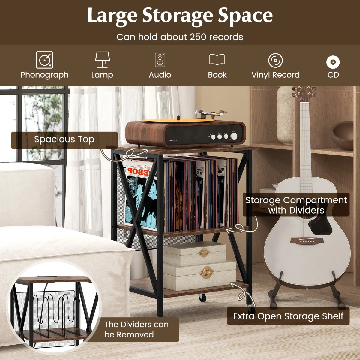 In deze kast passen ongeveer 250 platen. Met een open schap en opbergruimte met verdelers is hij perfect voor het organiseren van je platencollecties. Met het geïntegreerde oplaadstation met 2 stopcontacten, 2 USB-poorten en 1 Type-C-poort kun je je elektronische apparaten opladen. Verplaats hem op elke ondergrond dankzij de 4 wielen, waarvan er 2 vergrendelbaar zijn. De metalen steunpoten en stevige verbindingen zorgen voor duurzaamheid, en de slijtvaste houten planken zijn gemakkelijk schoon te maken. Hij kan gebruikt worden als standaard voor een platenspeler of nachtkastje.