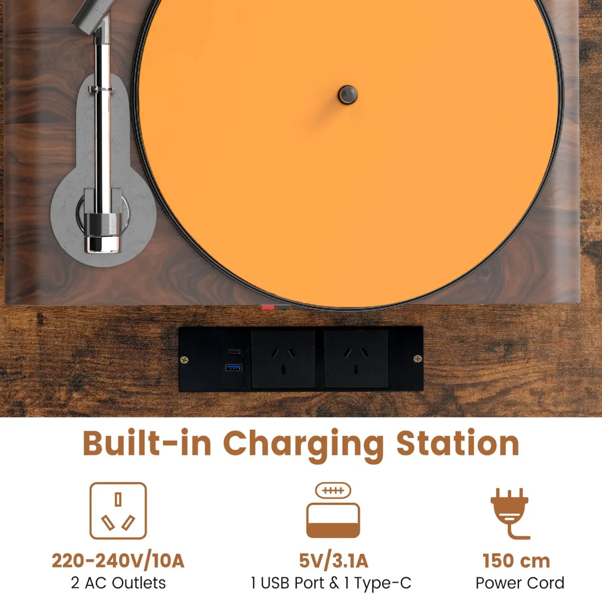 【Verzonken stroomaansluiting】: Het geïntegreerde laadstation beschikt over 2 stopcontacten, 1 USB- en 1 type C-aansluiting, zodat je je luidsprekers van stroom kunt voorzien of apparaten kunt opladen terwijl je je favoriete platen hoort. Bovendien zorgt het draadgat ervoor dat de kabels netjes en uit het zicht verdwijnen.