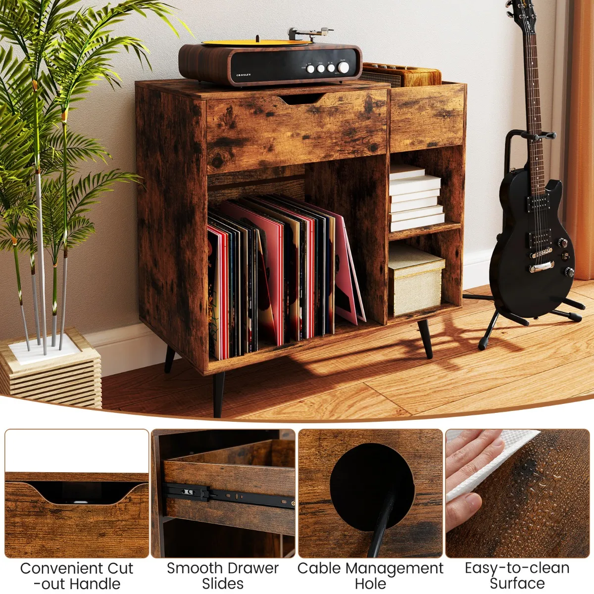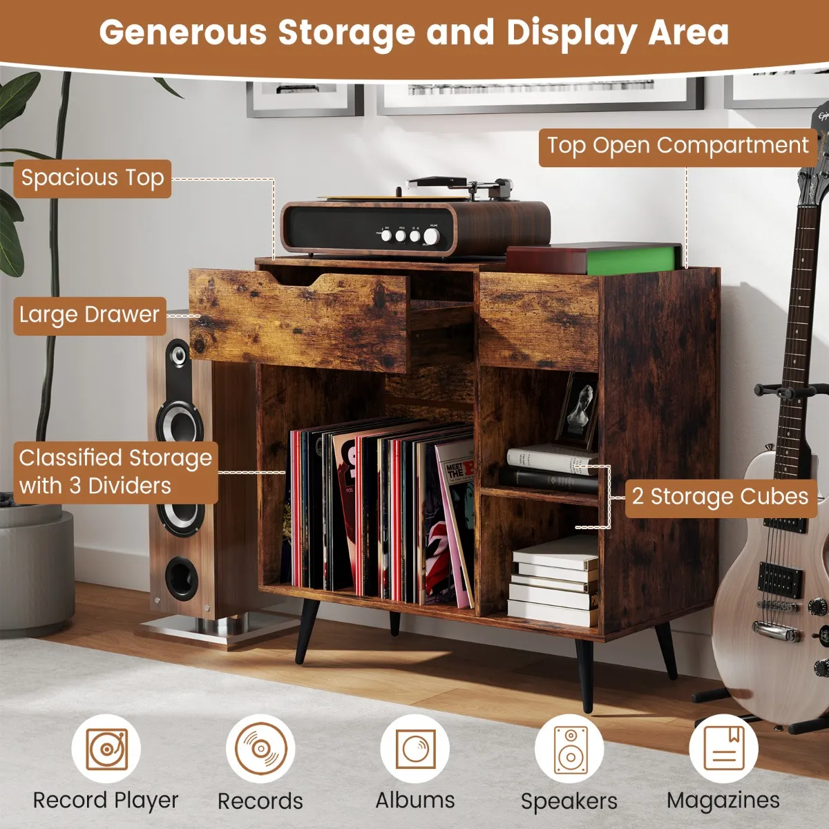 【Voldoende opbergruimte】: De draaitafelstandaard beschikt over een open vak met afneembare scheidingswanden, die flexibele opbergruimte biedt voor je vinylcollectie of andere media. De brede bovenkant, de uittrekbare lade en de planken aan de zijkanten zijn ideaal om grammofoonplaten of decoraties te presenteren.