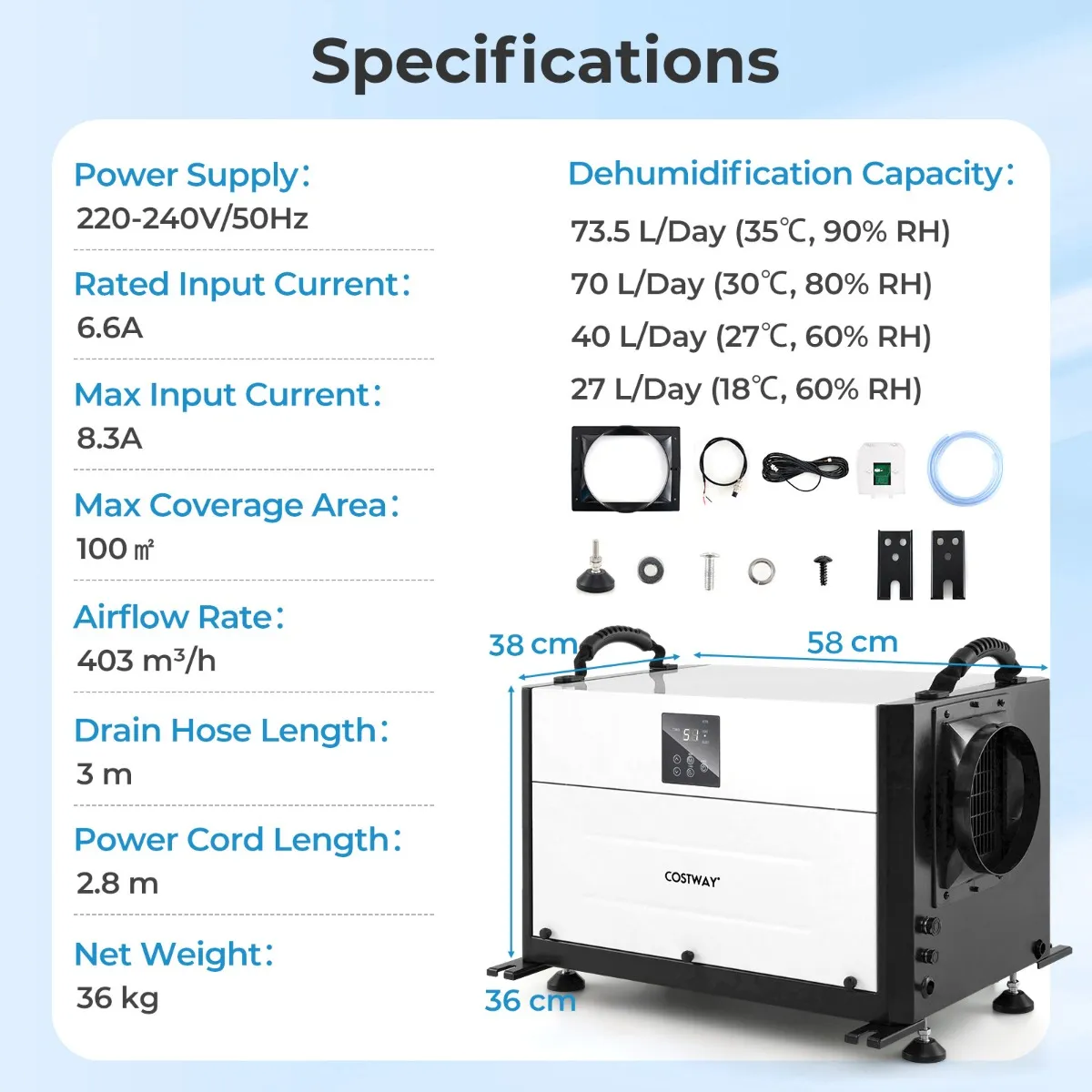 - Ontvochtigingscapaciteit: 73,5 L/dag (35℃, 90% RH)70 L/dag (30℃, 80% RH)40 L/dag (27℃, 60% RH)27 L/dag (18℃, 60% RH)