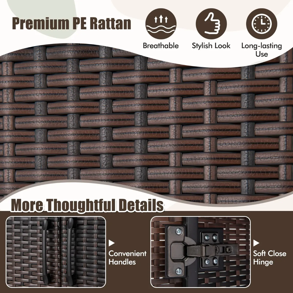 【Elegante uitstraling】Verfraai uw ruimte met deze opbergkast van PE-rotan voor een chique en natuurlijke uitstraling. Het elegante mandontwerp is niet alleen visueel aantrekkelijk, maar draagt ook aanzienlijk bij aan de duurzaamheid en weerstand tegen normale slijtage.