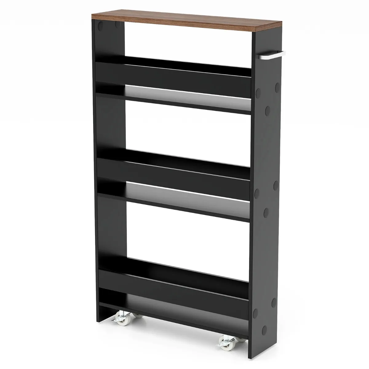 Met 4 opbergniveaus biedt hij een zinvolle indeling voor het organiseren van verschillende items. Of u nu keukenbenodigdheden, kantoorbenodigdheden, handwerkspullen of andere items moet opbergen, deze wagen kan elke taak aan. Zijn compacte en ruimtebesparende ontwerp helpt de opbergruimte in elke ruimte te maximaliseren en uw ruimte netjes en opgeruimd te houden. Er zijn gebruiksvriendelijke functies zoals 4 soepel rollende wielen en een handige handgreep. Samen met de verdikte plank is de rollende opbergtrolley een betrouwbare aanvulling op uw woonruimte. Breid de opbergruimte en functionaliteit van uw keuken uit met onze rollende trolley en geniet van een schone en georganiseerde ruimte.
