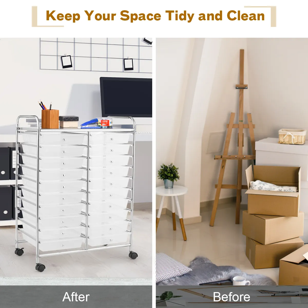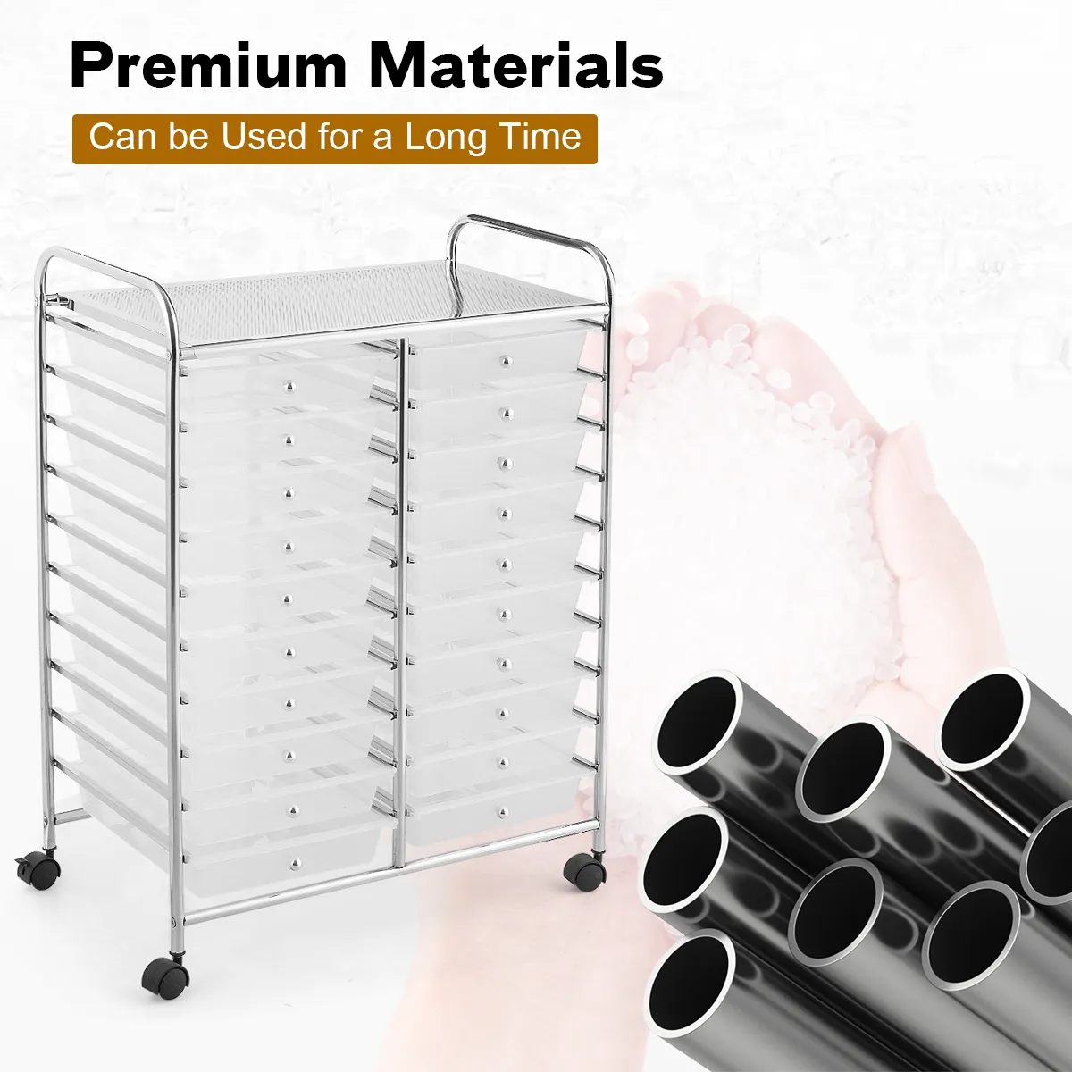 Komende met 20 laden en extra organizer bovenkant, deze opslag kar biedt grote ruimte om uw items op orde te houden. Bovendien is deze verrijdbare opbergkar gemakkelijk te verplaatsen of te trekken dankzij de 4 universele wielen (waarvan 2 vergrendelbaar) en de leuningen aan beide zijden. En het anti-roest stalen frame met chromen afwerking en premium PP materiaal zorgen voor een lange levensduur.