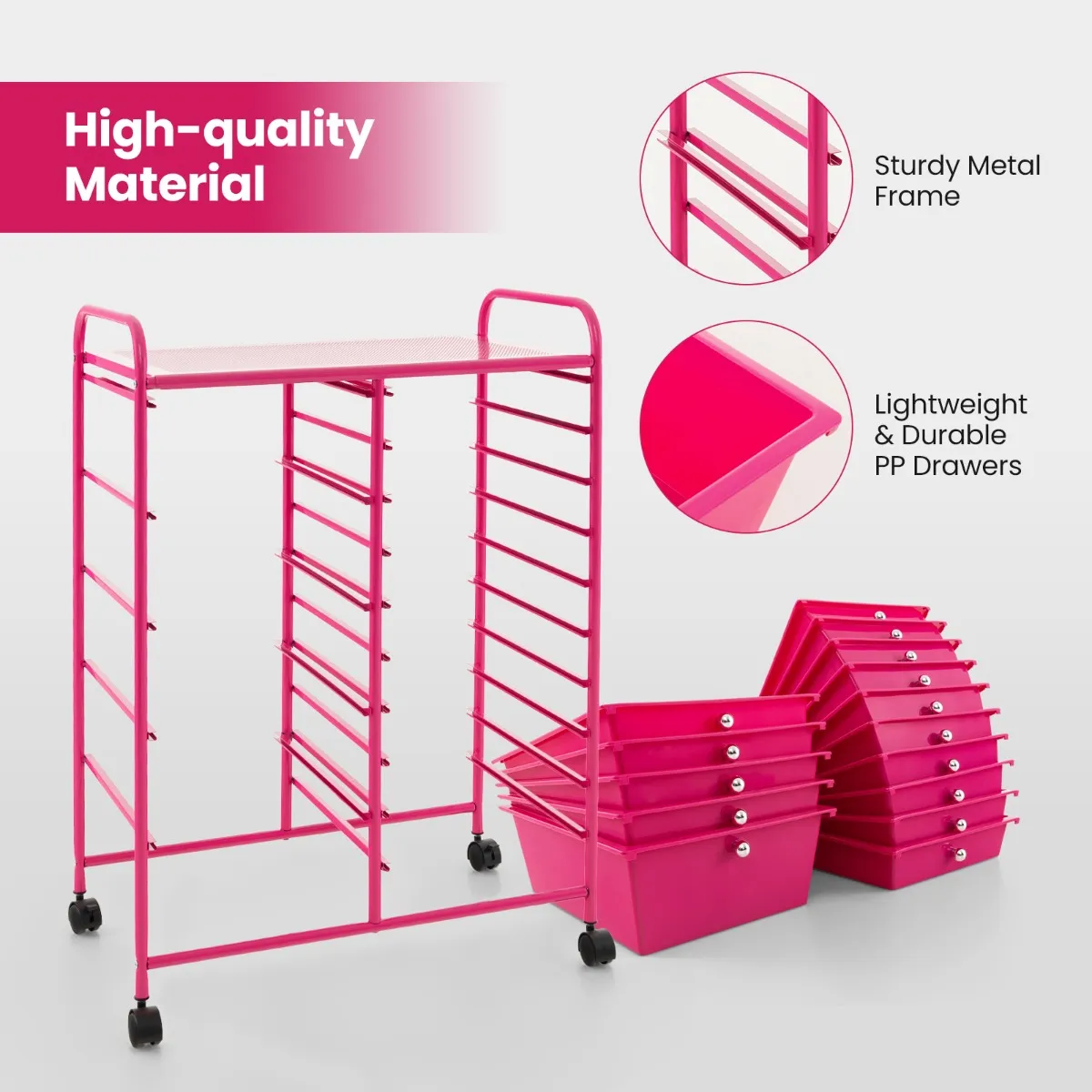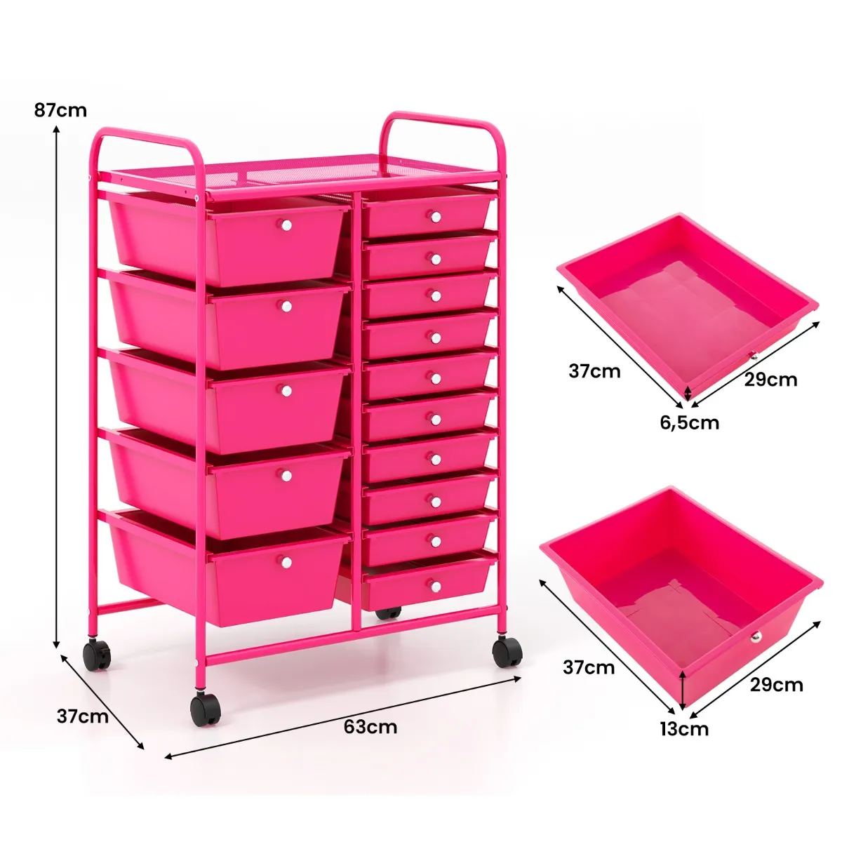 Met 15 uitneembare lades, 5 grote en 10 medium, biedt deze wagen veel opbergruimte. Het gegalvaniseerde metalen frame en de robuuste PP-laden zorgen voor langdurig gebruik, terwijl de 4 universele wielen (waarvan 2 afsluitbaar) een gemakkelijke verplaatsing mogelijk maken. Met gebruiksvriendelijke kenmerken zoals slanke handgrepen en handige knoppen is deze kar perfect voor opslag in de woonkamer, speelkamer, salon/kapsalon, of als opbergwagen voor knutsel- en naaibenodigdheden. Met afmetingen van 63 cm x 37 cm x 87 cm (L x B x H) bespaart de multifunctionele trolley ruimte op de vloer. Bestel nu en zorg ervoor dat de rommel tot het verleden behoort.