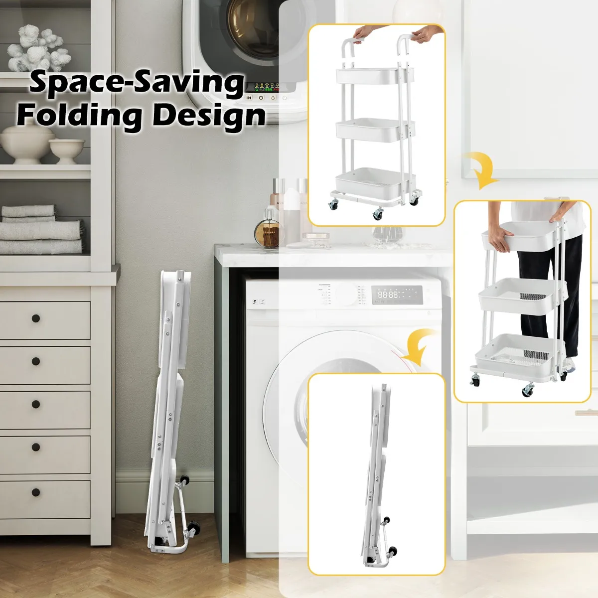 【Ruimtebesparend opvouwbaar ontwerp】: Deze multifunctionele trolley heeft een opvouwbare structuur voor snel en compact opbergen. De ingeklapte trolley is perfect voor kleine ruimtes en kan gemakkelijk worden opgeborgen als hij niet wordt gebruikt. Let op: maak eerst de handgrepen los.