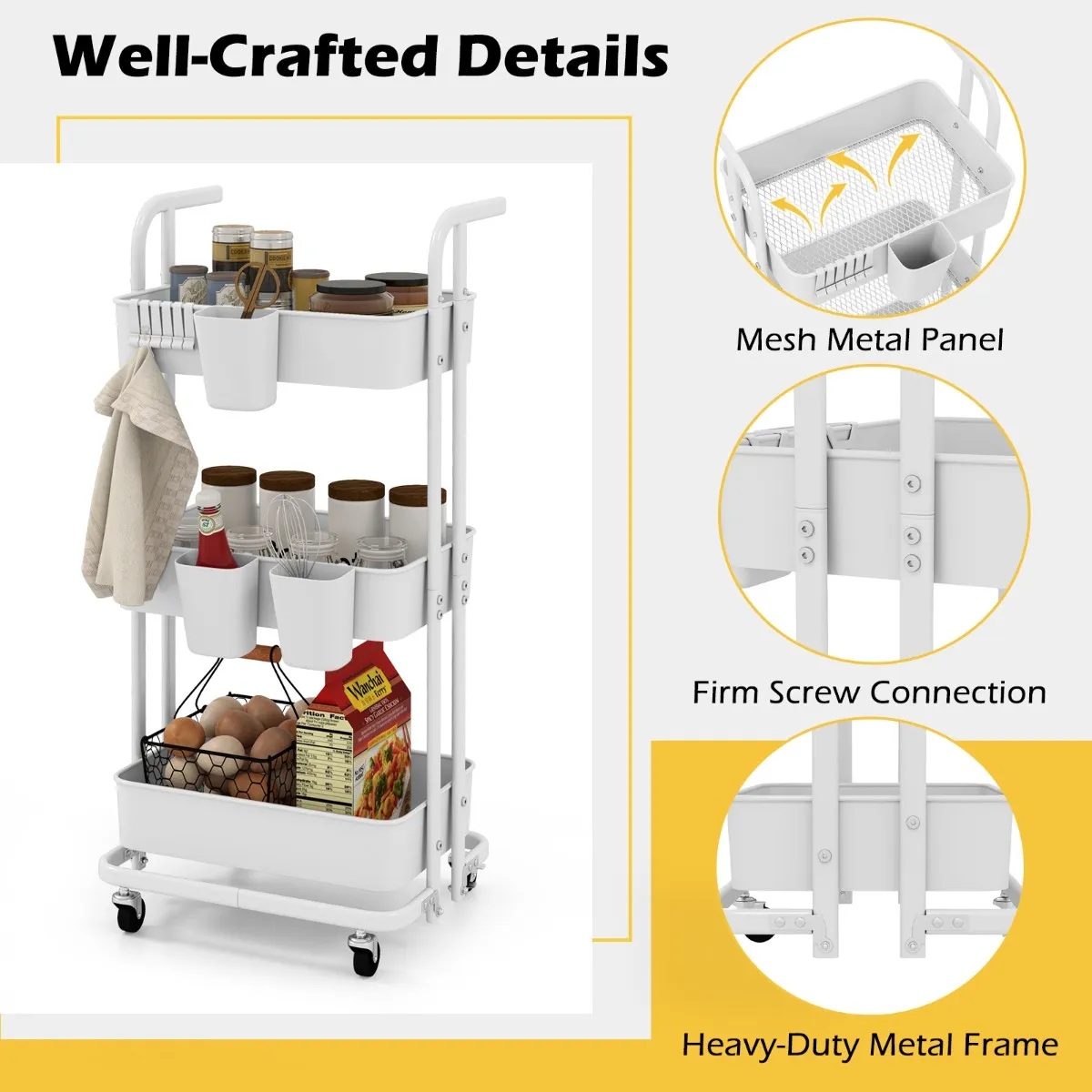 Deze rollende trolley biedt voldoende ruimte, een stevige metalen constructie en veelzijdig gebruik. Met 3 niveaus, haken en kopjes is de opslagtrolley ideaal voor het sorteren van verschillende items, terwijl het stevige metalen frame duurzaamheid garandeert. Met 4 wielen, waarvan 2 vergrendelbaar, biedt hij soepele mobiliteit en stabiliteit. Ideaal voor keukens, kantoren en hobbykamers, perfect voor je opslag- en transportbehoeften. Als je hem niet gebruikt, kun je hem gemakkelijk opbergen dankzij het opvouwbare ontwerp.